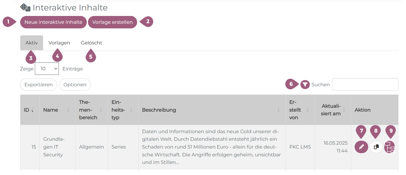 Unter Administration > Inhalt > Interaktive Inhalte können Sie die Übersicht von interaktiven Inhalten einsehen. In der Übersicht werden alle vorhandenen interaktiven Inhalte mit der zugehörigen ID, dem Namen, der Themenkategorie, dem Einheitstype, Beschreibung, Informationen zum Ersteller sowie dem Änderungsdatum gelistet. Die Spalten können jeweils durch einen Klick auf die Kopfzeile sortiert werden. Die folgenden Möglichkeiten stehen Ihnen zur Verfügung: (1) Über den “Neue interaktive Inhalte” Button, können Sie einen neuen Inhalt erstellen. (2) Über den “Vorlage erstellen” Button können Sie eine neue Vorlage erstellen. Mehr zu Vorlagen finden Sie unter: Nutzung von Templates (3) Im Reiter “Aktiv” werden Ihnen alle aktiven Inhalte angezeigt. (4) Im Reiter “Vorlagen” werden Ihnen alle Vorlagen angezeigt. (5) Im Reiter “Gelöscht” werden Ihnen alle gelöschten Inhalte angezeigt. (6) Über die Suche lässt sich der interaktive Inhalt filtern. (7) Um einen Inhalt zu bearbeiten oder ihn zu löschen, klicken Sie in der Übersicht am Ende der Zeile des gewünschten Inhalts auf das Editiersymbol. Alle Informationen zu diesem Inhalt werden Ihnen daraufhin in der Inhalt-Detailansicht angezeigt. (8) Um einen Kurs zu duplizieren, haben Sie die Möglichkeit, auf das Kopiersymbol zu klicken. (9) Um die Zuweisung der Inhalte zu sehen, klicken Sie auf das Ordnersymbol. Interaktive Inhalte: Überblick