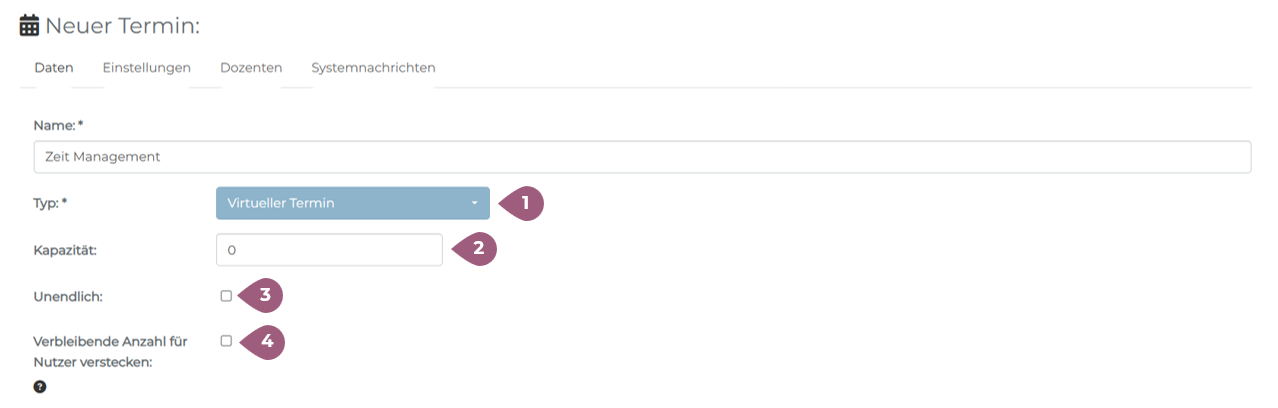 Bei einem virtuellen Termin erscheint die Kapazitätsangabe direkt unter dem Typ (1). Dort kann die gewünschte Kapazität eingetragen werden (2). Es ist außerdem möglich, eine unbegrenzte Kapazität festzulegen (3).