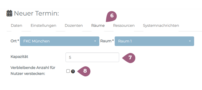 Bei Präsenzterminen erscheinen die Informationen zur Kapazität unter dem Reiter „Räume“ (6). Die Kapazität wird hierbei standardmäßig vom zugewiesenen Raum übernommen. Diese Zahl ist jedoch anpassbar: Auch wenn für den Raum eine Standardkapazität hinterlegt ist, kann sie pro Termin nach oben oder unten überschrieben werden (7).