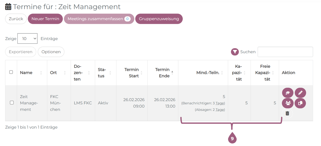 Informationen zur Mindestteilnehmerzahl sind für die Lernenden nicht sichtbar. Die Mindestteilnehmerzahl sowie die entsprechenden Benachrichtigungs- und Absageeinstellungen werden außerdem in der Termin-Übersichtsseite in der Spalte „Mind.-Teiln.“ dargestellt (9).