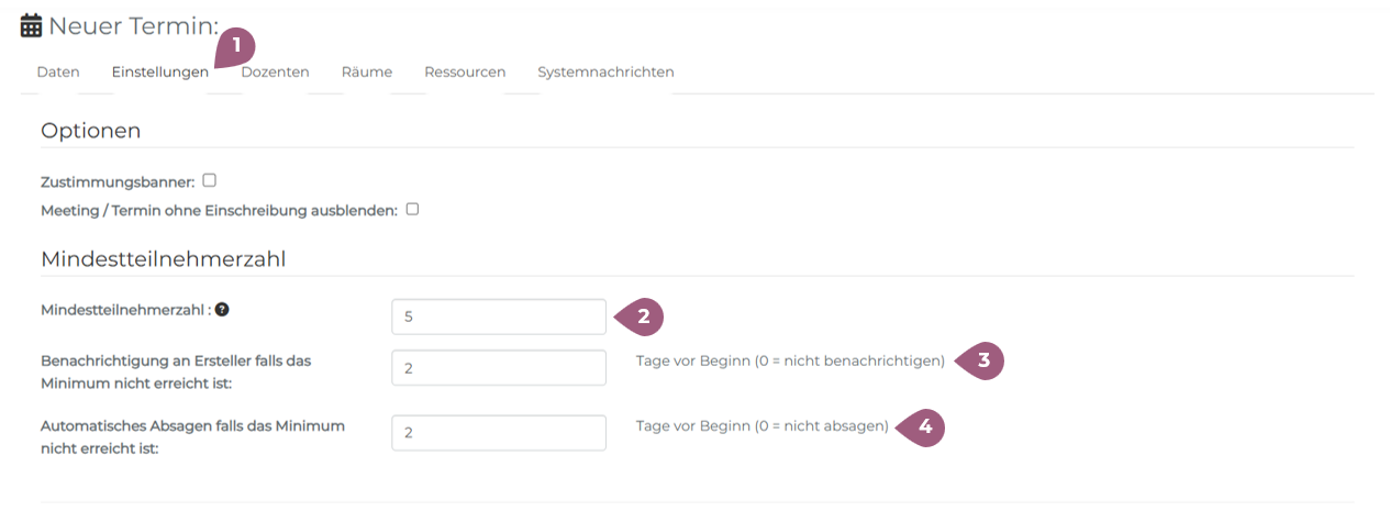 Mindestteilnehmerzahlen werden pro Termin festgelegt. Diese Einstellungen befinden sich unter dem Reiter „Einstellungen“ in der Termin-Erstellung (1). Dort ist es möglich, eine Mindestteilnehmerzahl festzulegen (2).