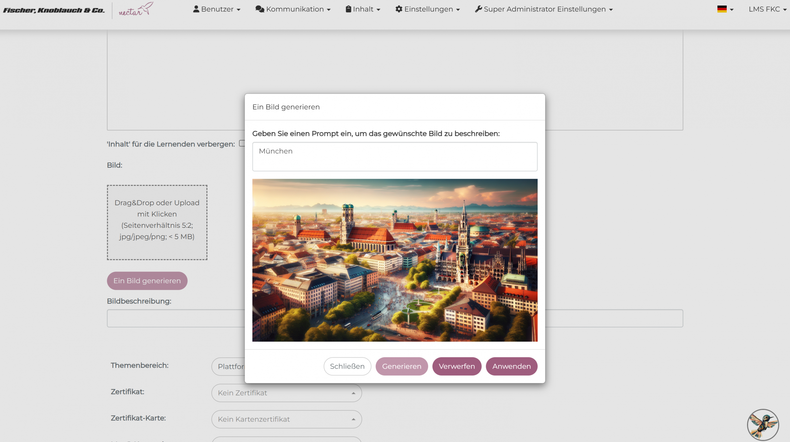 Die KI-Funktion kann Vorschaubilder für Lerneinheiten generieren. Der Administrator kann einen Prompt eingeben, anhand dessen ein Bild generiert wird. Nach der Generierung kann der Administrator entscheiden, ob das Bild angenommen oder abgelehnt wird.