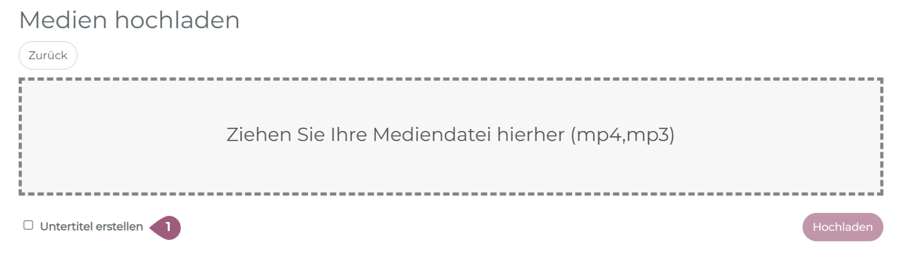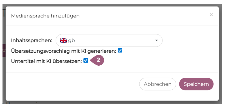 Die KI-Funktion kann Untertitel für Videos bereits während des Hochladens übersetzen. So müssen Sie diese nicht zusätzlich bei der Produktion Ihrer Videos erstellen. Dies kann vor dem Upload aktiviert werden (1).