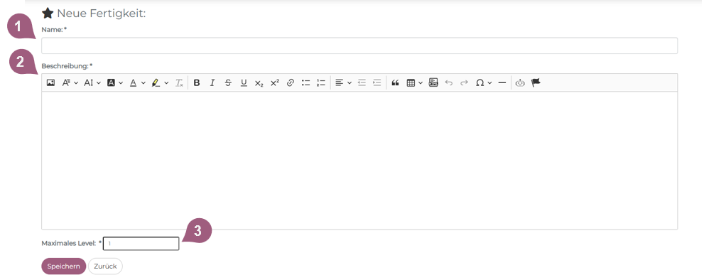 Nachdem der Name (1) und die Beschreibung (2) der Kompetenz eingegeben wurden, kann das maximale Level (3) festgelegt werden. Hierüber definieren Sie die höchstmögliche Kompetenzstufe.