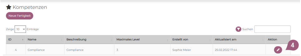Kompetenzen können nach dem Speichern auch über das Editiersymbol (4) bearbeitet werden.