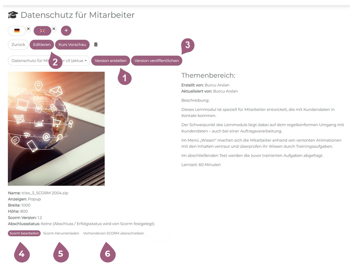 Sie können die Kurseinstellungen für die aktuelle Version anpassen, die vorhandene SCORM-Datei bearbeiten (4), herunterladen (5) oder überschreiben (6).