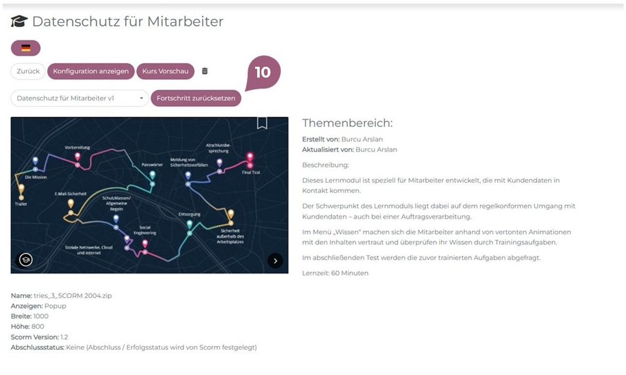 Sie können die Fortschritte für eine bestehende Version zurücksetzen (10), um zu erreichen, dass alle Benutzer die neueste Version angezeigt bekommen. Dabei haben Sie die Möglichkeit, alle unvollständigen Fortschritte für vorige Versionen zurückzusetzen oder aber komplett alle Fortschritte. Die Fortschritte für die vorige Version sind in diesem Fall für alle Benutzer gelöscht.