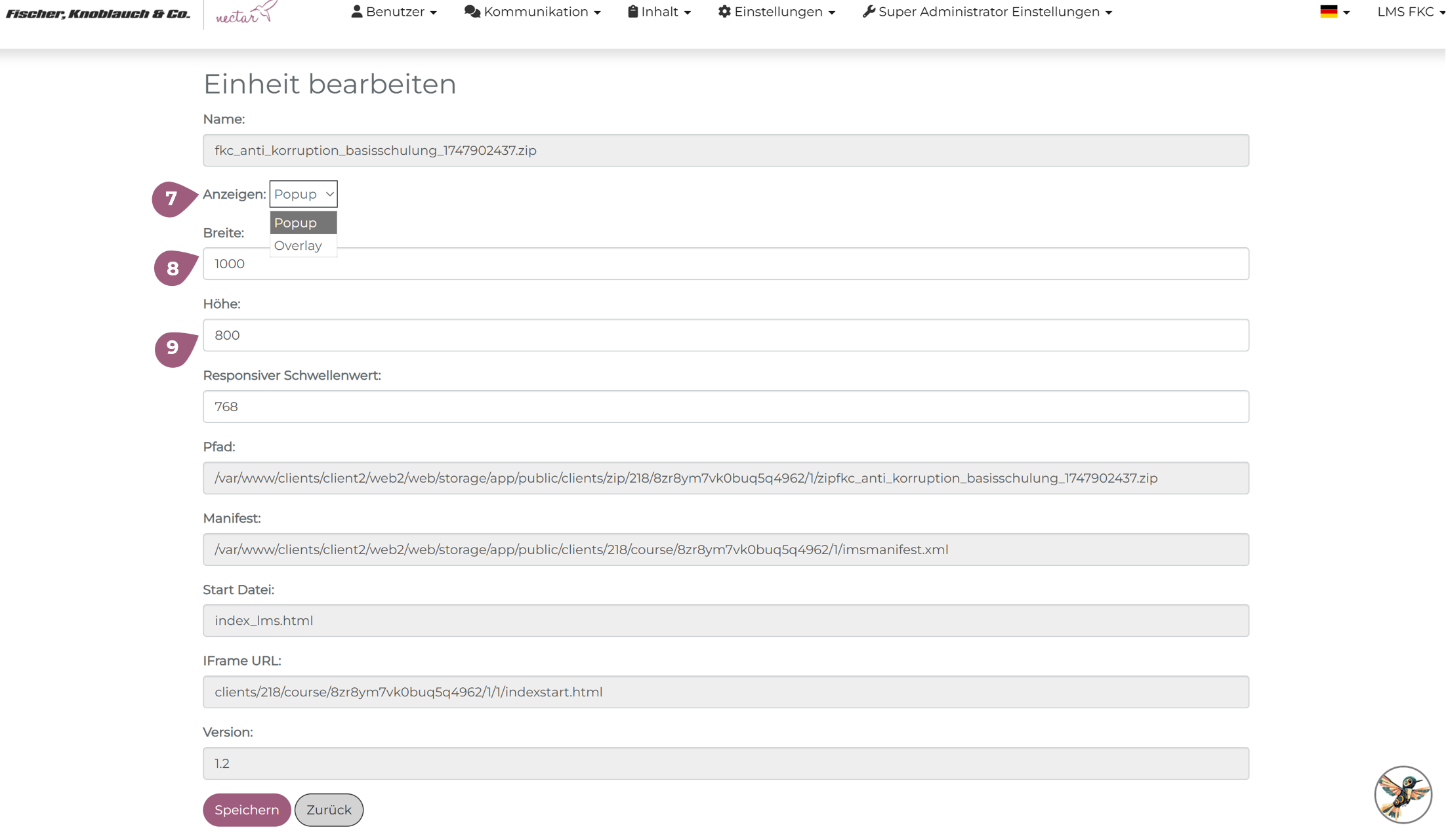 Der Button “Scorm bearbeiten” öffnet die SCORM-Einstellungen, in denen Sie die Art der Anzeige (7) sowie die Breite (8) und Höhe (9) des Fensters anpassen können: