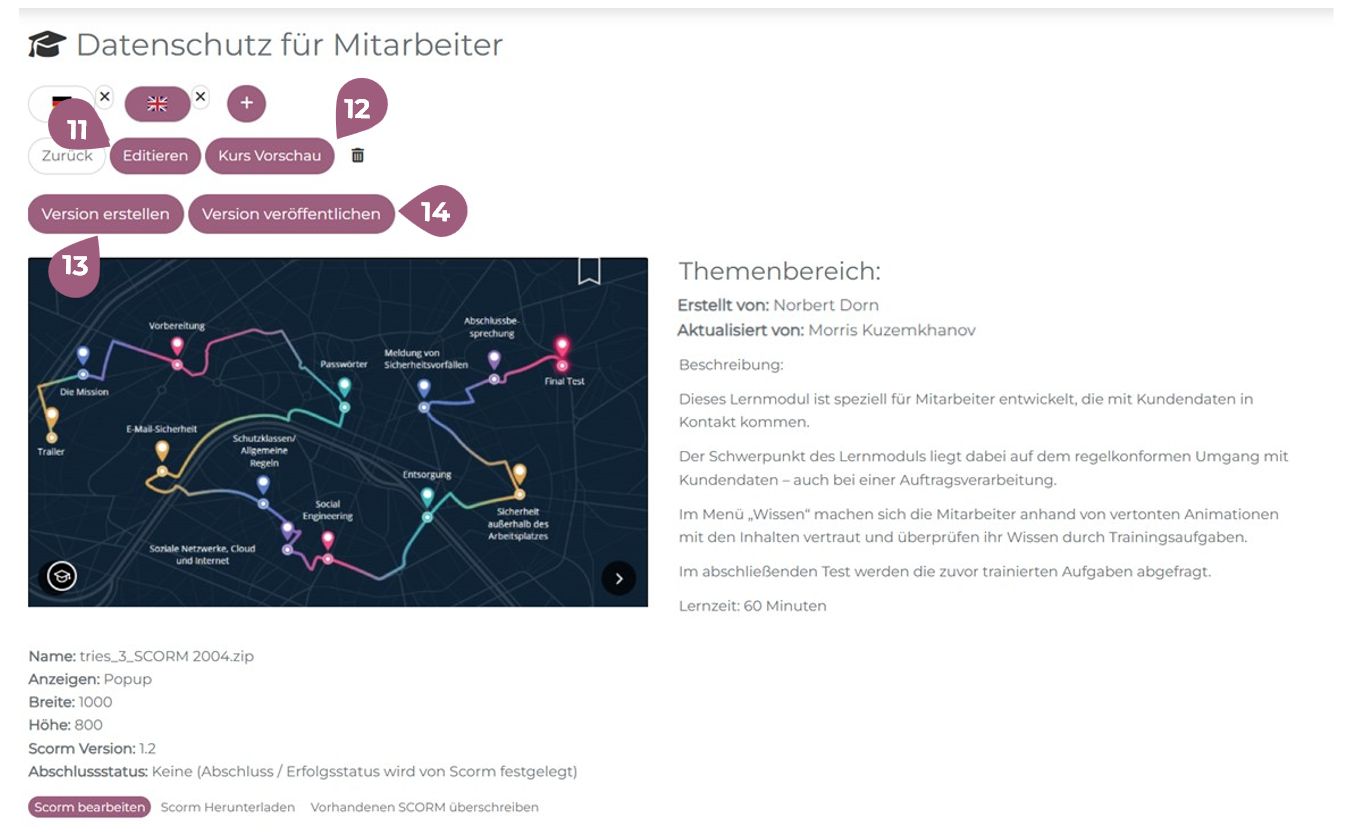 Nachdem Ihre SCORM-Datei hochgeladen wurde, haben Sie die Möglichkeit Ihre Kursübersicht noch einmal zu überprüfen.