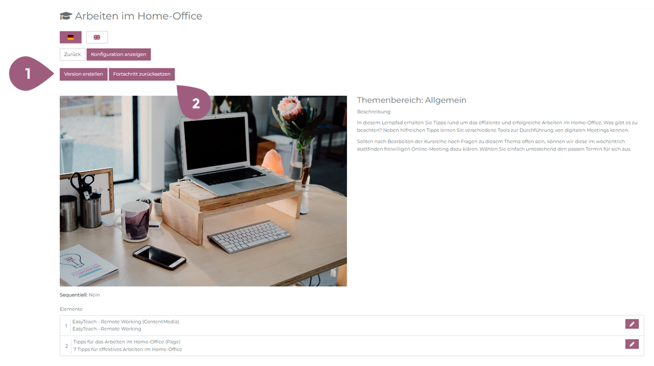 (1) Durch Klick auf „Version erstellen” wird eine Kopie der Kursreihe erstellt, in der die Einstellungen nun wieder editierbar sind. So können Kursreiheneinstellungen für die aktuelle Version angepasst und Elemente entfernt oder hinzugefügt werden.