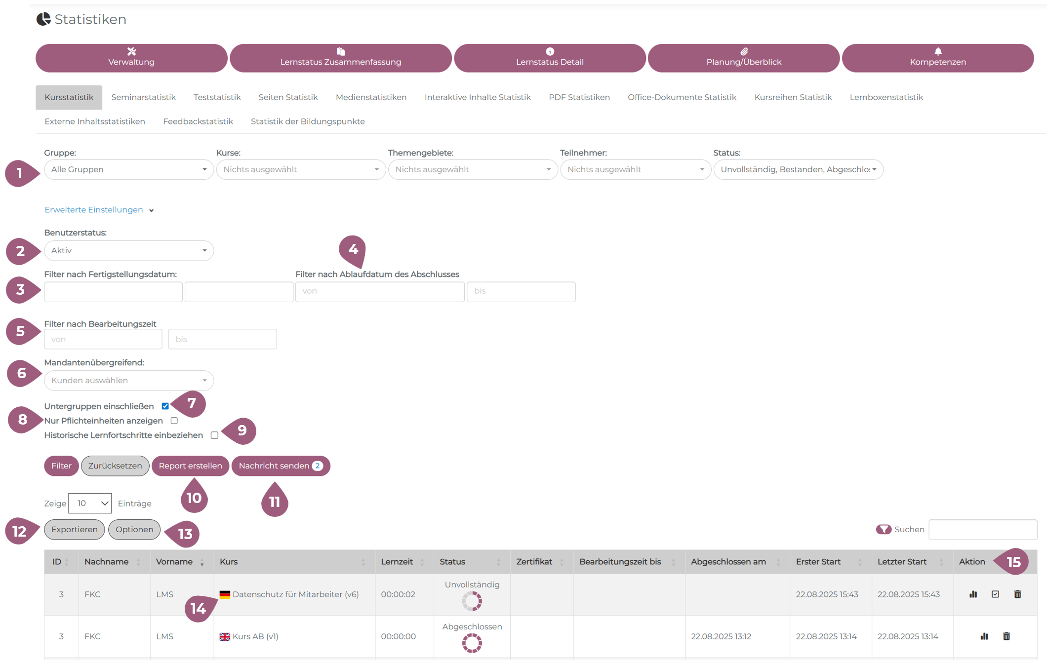 In der Kursstatistik (Lernstatus Detail) sind Ergebnisse für einzelne Kurse und einzelne Lerner bzw. Gruppen aufgeführt. Folgende Filtermöglichkeiten (Mehrfachauswahl ist möglich) und Optionen stehen Ihnen dort zur Verfügung: