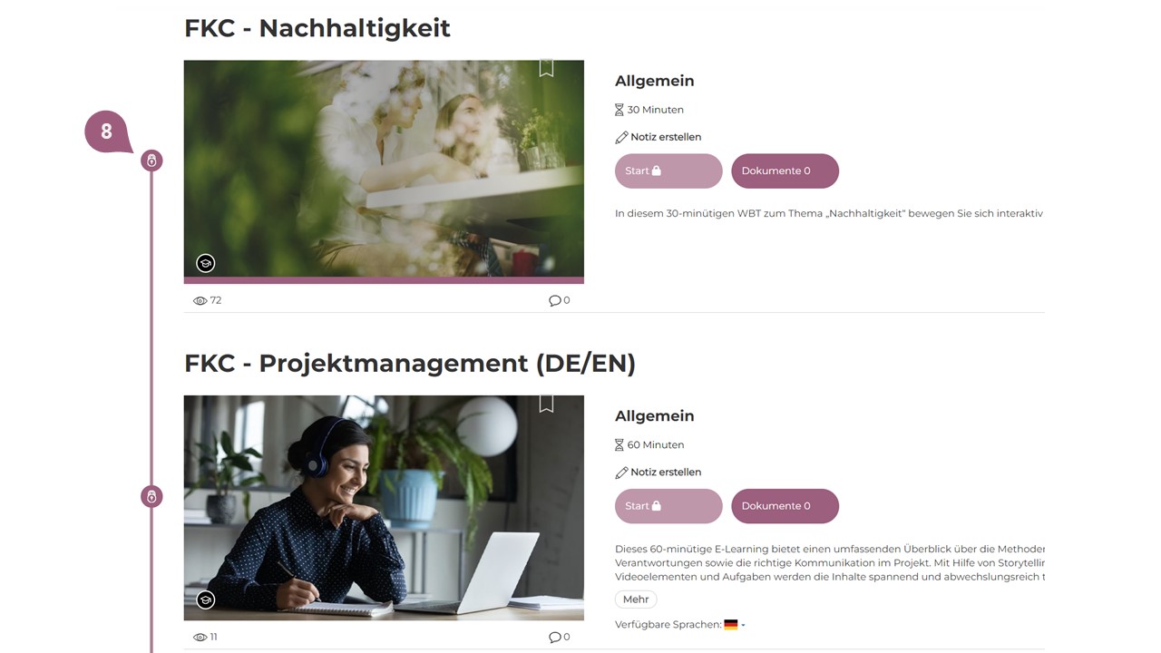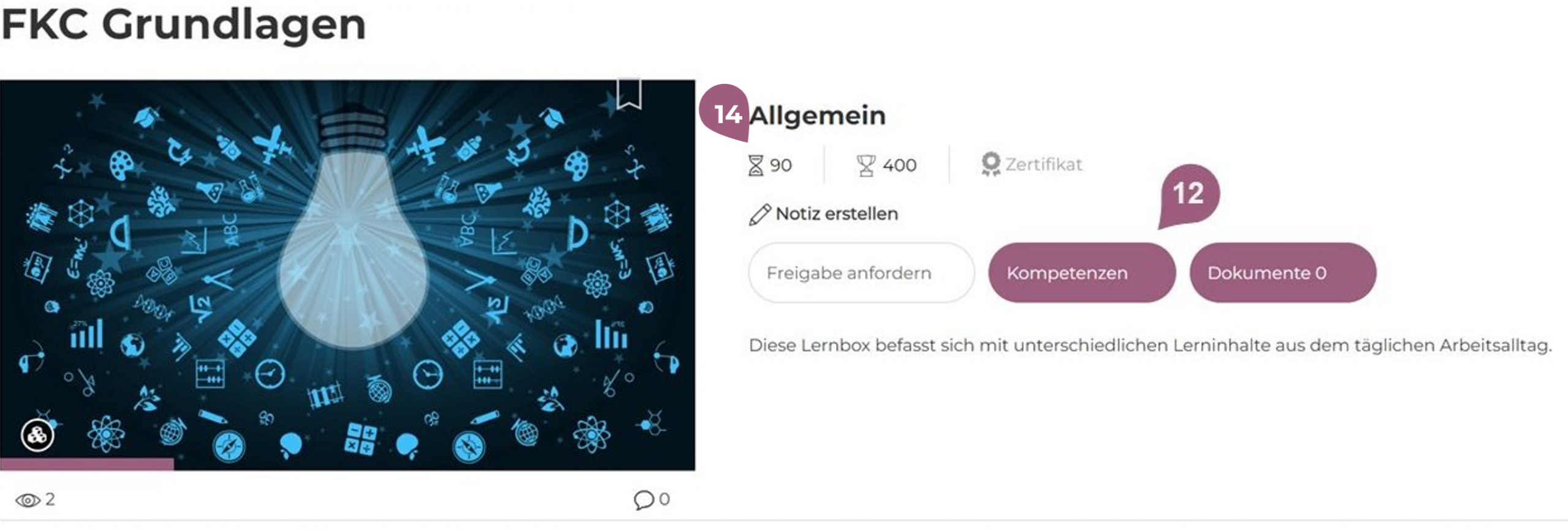 In der Lerneransicht ist zusätzlich die Lernzeit (14) in Minuten für diese Lernbox sichtbar. Die Lernzeit der Lernbox wird automatisch anhand der Lernzeiten der Lerneinheiten in der Lernbox vom System berechnet. Wenn keine Lernzeit für die Lerneinheiten angegeben wurde, wird hier nichts angezeigt.