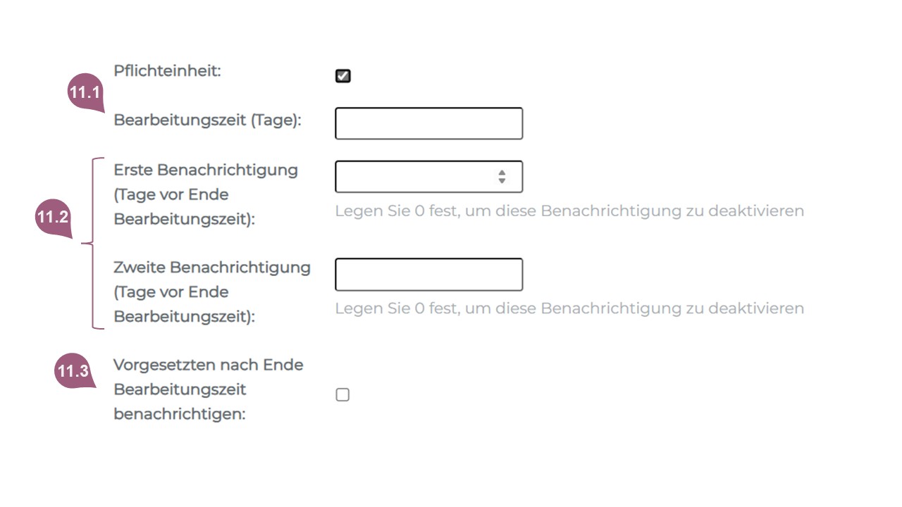 (11) Wenn die Pflichteinheit aktiviert ist, erhalten die Lernenden eine Benachrichtigung, sobald die Lernbox für sie verfügbar ist und bis wann es abzuschließen ist. Der gewünschte Bearbeitungszeitraum (11.1) sowie die Frequenz der Reminder-Nachrichten (11.2) lässt sich individuell angeben. Ebenso können Sie einstellen, dass der Vorgesetzte nach Ende des Bearbeitungszeitraums benachrichtigt (11.3) wird. Sobald Sie das Häkchen gesetzt haben, können Sie angeben wann der Lernende benachrichtigt werden soll. Hierbei gibt es drei Eskalationsstufen, der Lernende wird zwei Mal darüber benachrichtigt, dass die Lernbox noch absolviert werden muss. Beim dritten Mal können Sie angeben, ob der Vorgesetzte ebenfalls benachrichtig werden soll.