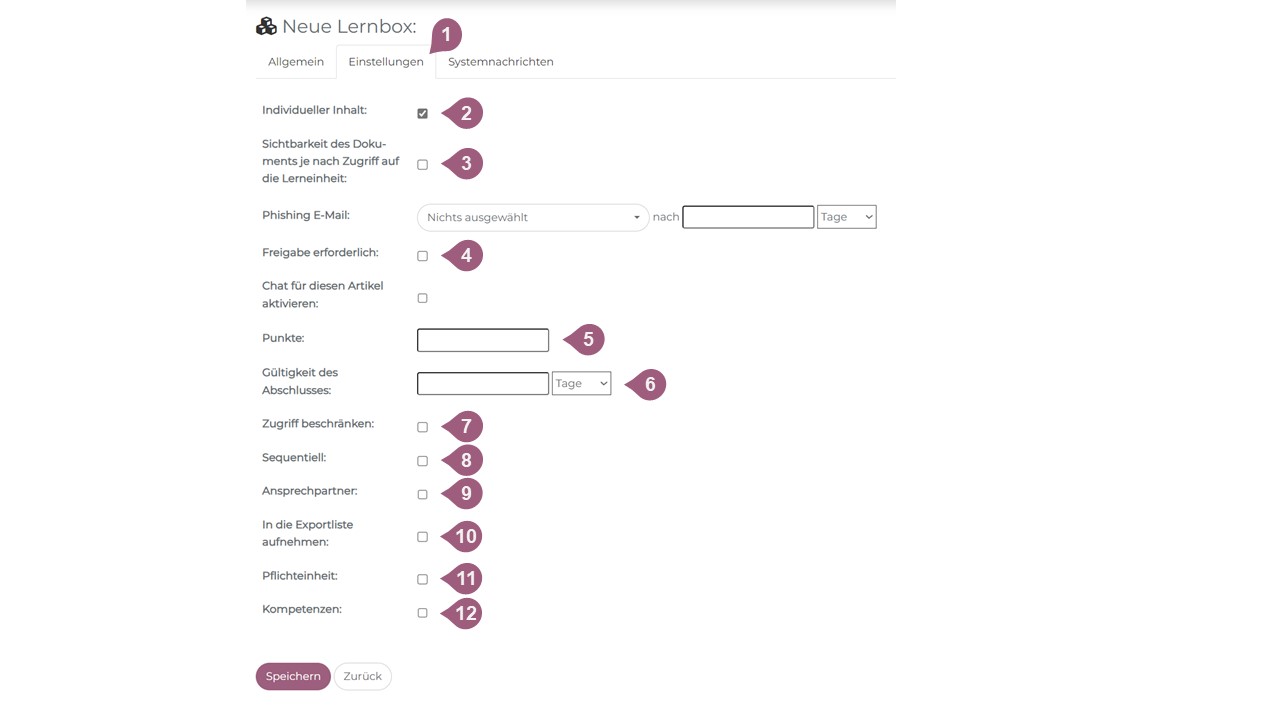 Nachdem Sie alle Einstellungen getroffen haben und diese speichern (13), können Sie im nächsten Schritt Lernboxen erstellen.