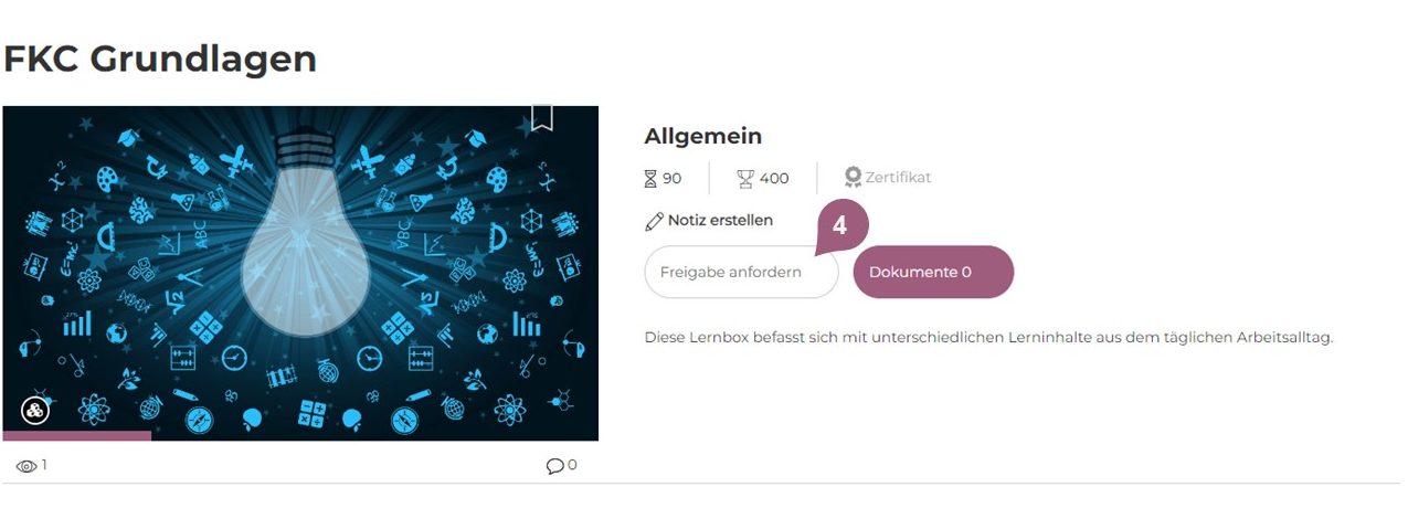 (4) Wenn für eine Lernbox die Option „Freigabe erforderlich” aktiviert wird, muss die Freischaltung für dieses zuerst vom Vorgesetzten erteilt werden, bevor die Lernenden die Lernbox starten können. Anstelle des „Starten“-Buttons sehen die Lernenden in diesem Fall das Feld „Freigabe anfordern“, über welches er bei seiner im LMS hinterlegten Führungskraft die Freigabe beantragen kann. Die Führungskraft erhält daraufhin eine Benachrichtigung im LMS sowie – je nach Konfiguration – auch per E-Mail.