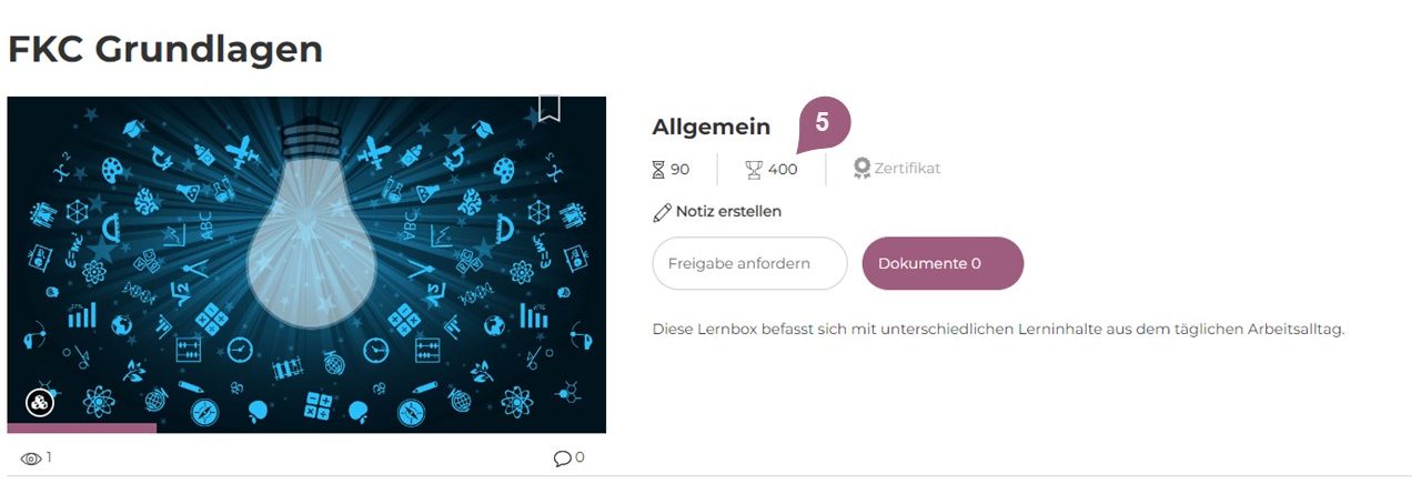 (5) Die eingestellte Punktzahl erhalten die Lernenden nach Absolvieren der Lernbox. Diese Punktzahl wird dem Punktekonto der Lernenden (oben rechts im Lernerbereich sichtbar) hinzugefügt, sofern „Gamification“ unter Administration > Einstellungen > Konfiguration aktiviert ist. Ebenfalls werden die kürzlich erhaltenen Punkte in der entsprechenden Übersicht auf dem Dashboard aufgeführt.