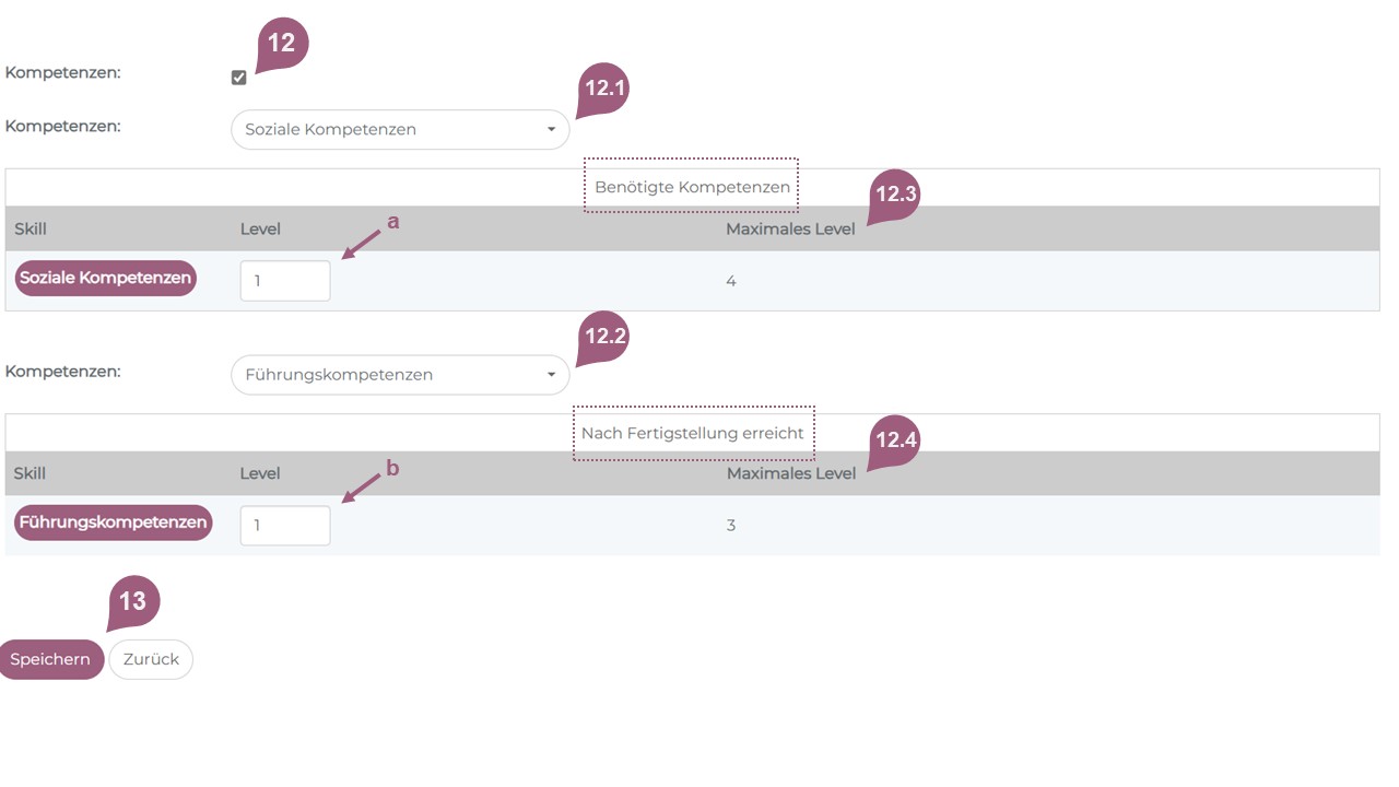 (12) Über diese Checkbox wählen Sie die Kompetenzen aus, die die Lernenden als Voraussetzung zum Teilnehmen an einer Lernbox benötigen sowie Kompetenzen, welche die Lernenden nach erfolgreicher Fertigstellung der Lernbox erhalten. Die vorausgesetzten Kompetenzen (12.1) und die erworbenen Kompetenzen (12.2) können Sie mithilfe des Dropdown-Menüs auswählen. Sie haben die Möglichkeit, ein Level anzugeben, welches erreicht sein muss (a) bevor teilgenommen werden kann bzw. (b) welches erreicht wird nachdem teilgenommen wurde. Das maximale Level dabei zeigt an, wie viele Level erreicht sein müssen (12.3) bzw. erreicht werden können (12.4). Kompetenzen können Sie über Administration > Einstellungen > Kompetenzen hinterlegen. Wenn Sie einzelne Kompetenzen entfernen möchten, können Sie die über das Dropdown-Menü abwählen. Wenn Sie alle Kompetenzen deaktivieren möchten, entfernen Sie das Häkchen für Kompetenzen und speichern den Vorgang ab.