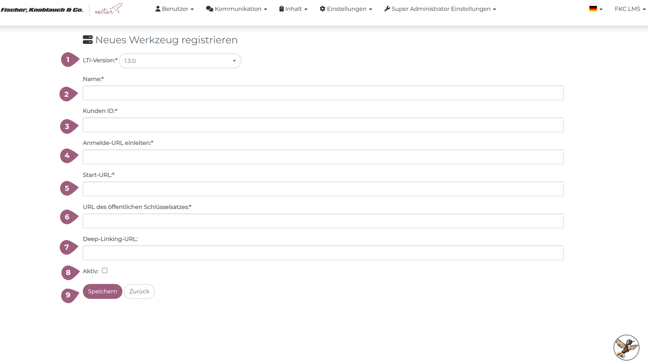 Bevor einzelnen externe Lernelemente in das nectar LMS integriert werden können, muss zuerst ein LTI-Werkzeug (LTI-Tool) im nectar LMS erstellt werden. Dies erfolgt unter Administration > Super Administrator Einstellungen > LTI-Konfiguration > Neues Werkzeug registrieren: