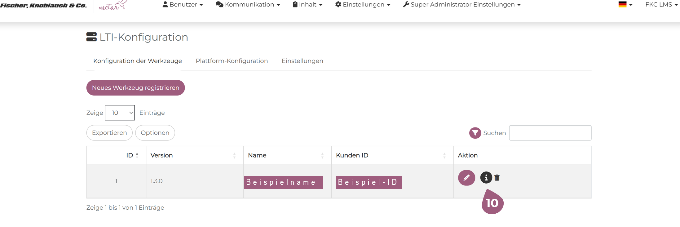 Nach dem Aktivieren (8) und Speichern (9) finden Sie unter Ihre Werkzeuge in der Spalte Aktion über das i-Symbol (10) die Informationen, die Sie dem LTI-Publisher mitteilen müssen.