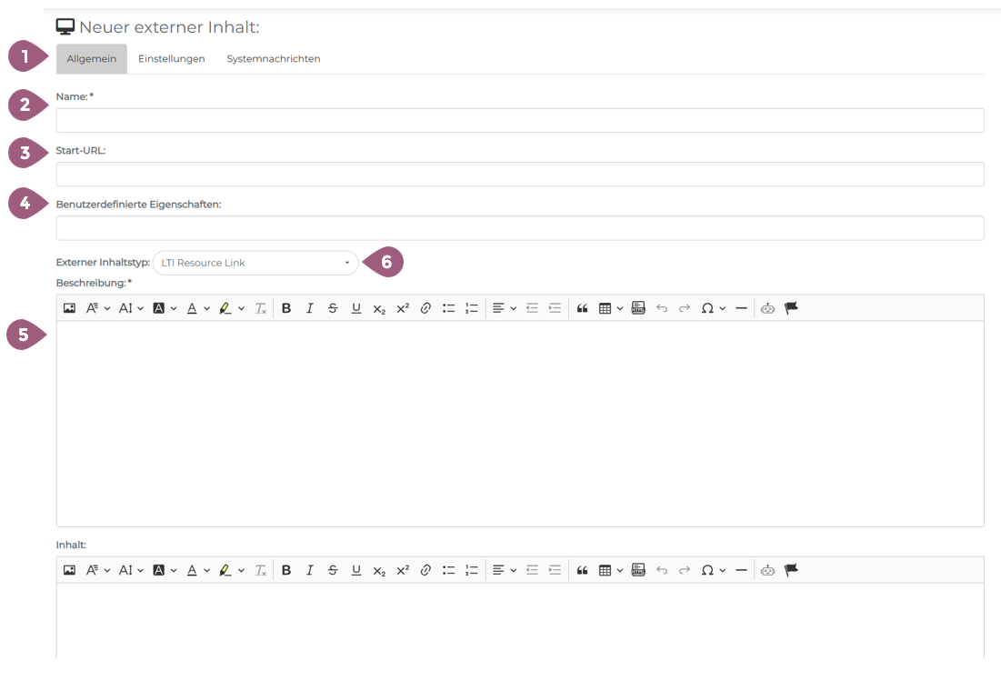 Unter Allgemein (1) geben Sie zunächst folgende Informationen ein: Name des Kurses (2), URL-Link (3), Benutzerdefinierten Eigenschaften (4) und Beschreibung des Kurses (5).