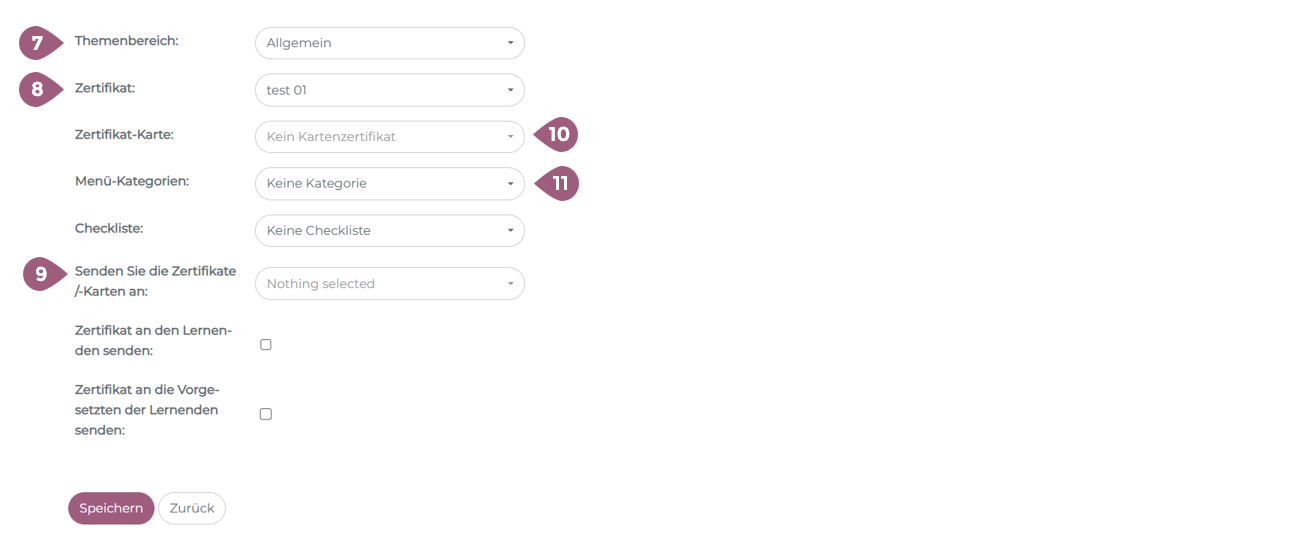 Sofern die Teilnehmenden nach Abschluss des Kurses ein Zertifikat (8) erhalten sollen, wählen Sie dies aus dem entsprechenden Dropdown aus. Die Zertifikate werden den Teilnehmenden nach Abschluss des Kurses über die Teilnehmerliste zur Verfügung gestellt.
