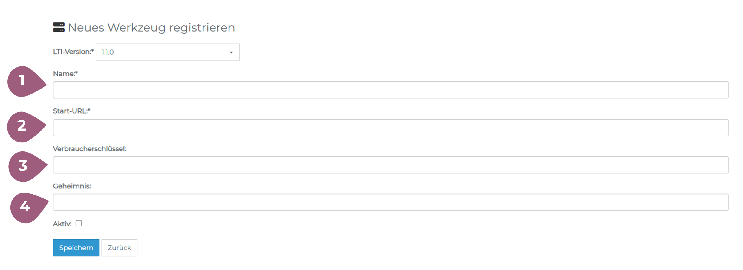 Um ein neues Werkzeug zu registrieren, ist ein Name zu vergeben (1) und die vom LTI-Publisher zur Verfügung gestellten Daten, Start-URL (2), Verbaucherschlüssel / Key (3) und das Geheimnis / Shared Secret (4) einzugeben.
