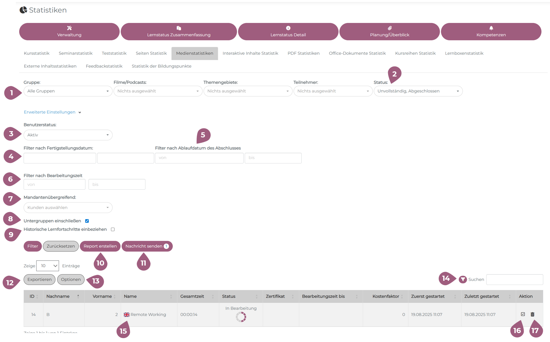 In der Medien Statistiken kann eine Übersicht der Status aktuell zugewiesener Mediapool Objekten erfolgen. Unter Administration > Benutzer > Statistiken > Lernstatus Detail finden Sie die Medienstatistiken. Folgende Optionen stehen Ihnen dort zur Verfügung: (1) Filter nach Gruppen, einzelnen PDF-Dokumenten, Themengebieten und Teilnehmern (2) Filter nach Status (Nicht gestartet / Unvollständig / Abgeschlossen) Nach Aufklappen der „Erweiterten Einstellungen”: (3) Filter nach Benutzerstatus (aktiv / inaktiv / alle) Filter nach Fertigstellungsdatum (4), Ablauf des Abschlusses (5) oder der Bearbeitungszeit (6) des Media Objekts stehen Ihnen zur Verfügung. (7) Mandantenübergreifend: Bei mandantenübergreifenden Medien Objekten können Sie hier auswählen aus welchen Mandanten die Statistikergebnisse angezeigt werden. (8) Option „Untergruppen einschließen“: Wenn diese Funktion deaktiviert ist, werden nur Ergebnisse für exakt die Gruppe, die unter (1) ausgewählt wurde, angezeigt. (9) Option “Historische Lernforschritte einbeziehen”: Wenn diese Funktion aktiviert ist, werden auch abgelaufene Abschlüsse angezeigt. (10) Es ist zudem möglich, eine Auswahl von Filtern durch Klick auf „Report erstellen“ zu speichern. Gespeicherte Reports ermöglichen es, eine bestimmte Filter-Einstellung im Tab „Statistische Berichte“ jederzeit mit einem Klick wieder zu öffnen. Dies bietet sich an, wenn eine bestimmte Auswertung regelmäßig erstellt werden muss und vermeidet, dass jedes Mal alle Filter erneut ausgewählt werden müssen. (11) Über den Button „Nachricht senden” kann den Benutzern auf Basis der gewählten Filter direkt eine Nachricht gesendet werden. (12) Über den Export-Button lassen sich die Ergebnisse als Excel-Datei exportieren. (13) Über den Button „Optionen“ können die Sichtbarkeit sowie die Reihenfolge der Spalten angepasst werden. (14) Mit dem Filtersymbol ist es möglich, jede Spalte individuell zu filtern, um gezielter suchen zu können. (15) Der Flagge Symbol zeigt auf welche Sprache die Medien-Objekte erledigt werden. (16) Durch einen Klick auf das Checkbox in der Spalte “Action” kann ein Media Objekt geschlossen werden. (17) Durch einen Klick auf das Müll-Symbol in der Spalte „Aktion“ kann ein Media Objekt von einem Teilnehmern gelöscht werden. Medienstatistiken