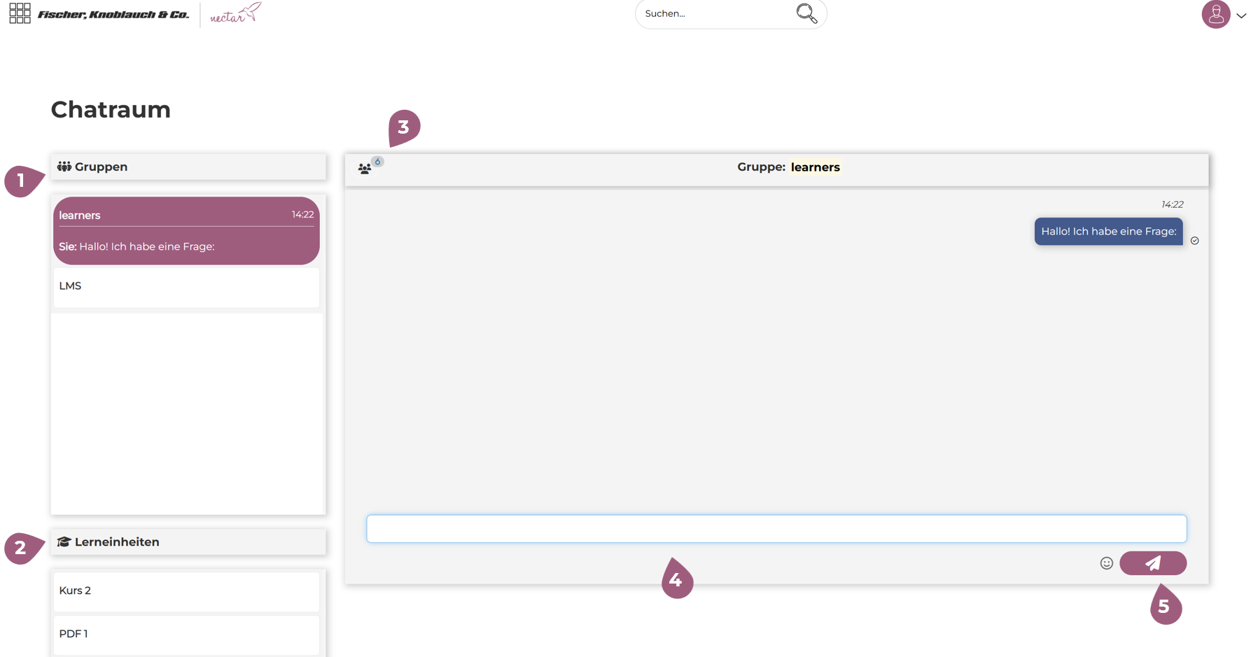 In dem weißen Feld (4) können Sie direkt in jeder Gruppe schreiben und dies über den Pfeil-Button (5) den entsprechenden Gruppen-Mitgliedern schicken.