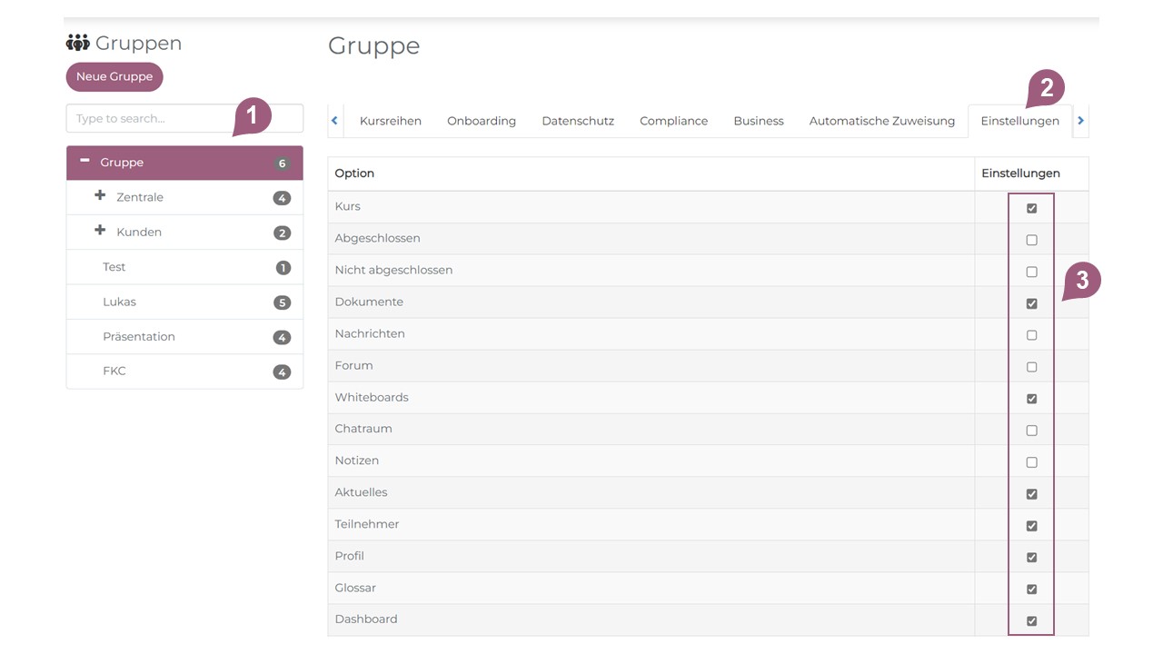 Im Administrationsbereich können Sie einstellen, welche Menü-Funktionen für welche Gruppen sichtbar sein sollen. Nähere Informationen zur Gruppenstruktur im nectar LMS erhalten Sie im entsprechenden weiterführenden Artikel.