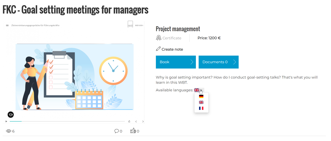 - Wenn mehrere Sprachversionen für ein Lernelement angelegt sind, haben Lerner die Möglichkeit, sich aus diesen die gewünschte Sprachversion auszuwählen.