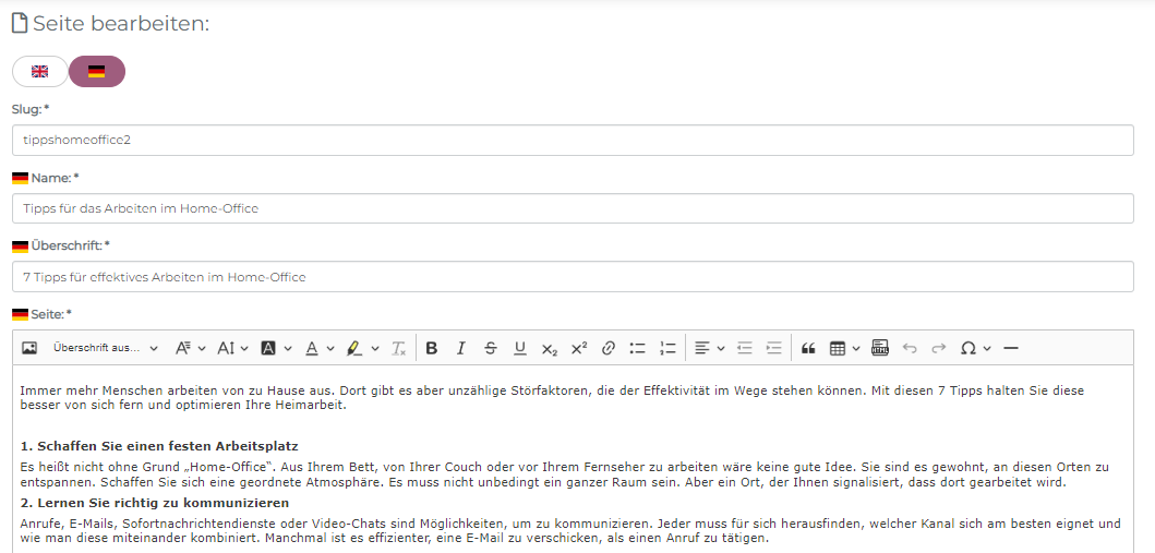 - Durch Klick auf die entsprechenden Flaggen (2) wechseln Sie zwischen den Sprachen und können für jede Sprache die Inhalte separat anpassen (3):