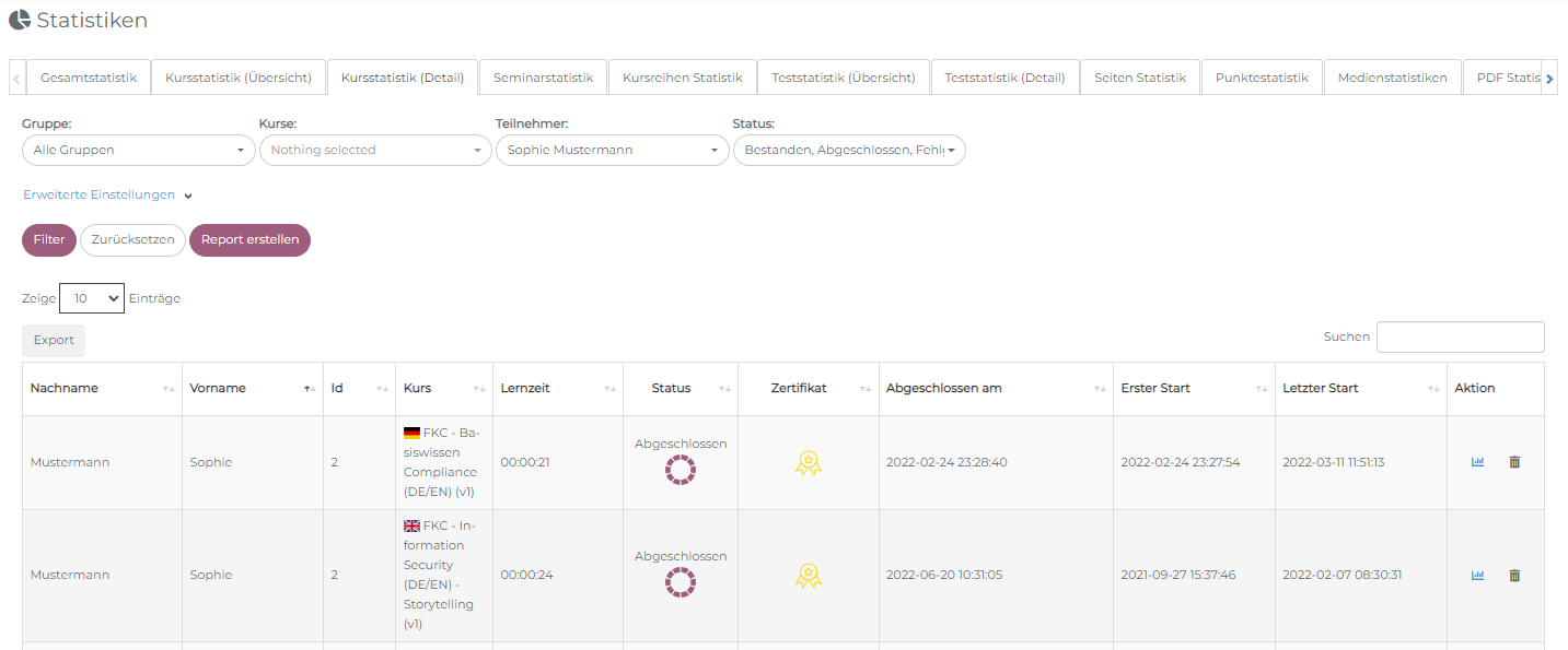 Ein Lernelement, für das mehrere Sprachversionen existieren, wird in der Statistik als ein einziger Eintrag angezeigt. Dabei wird durch eine Flagge angezeigt, in welcher Sprache ein Lerner die Einheit absolviert hat.