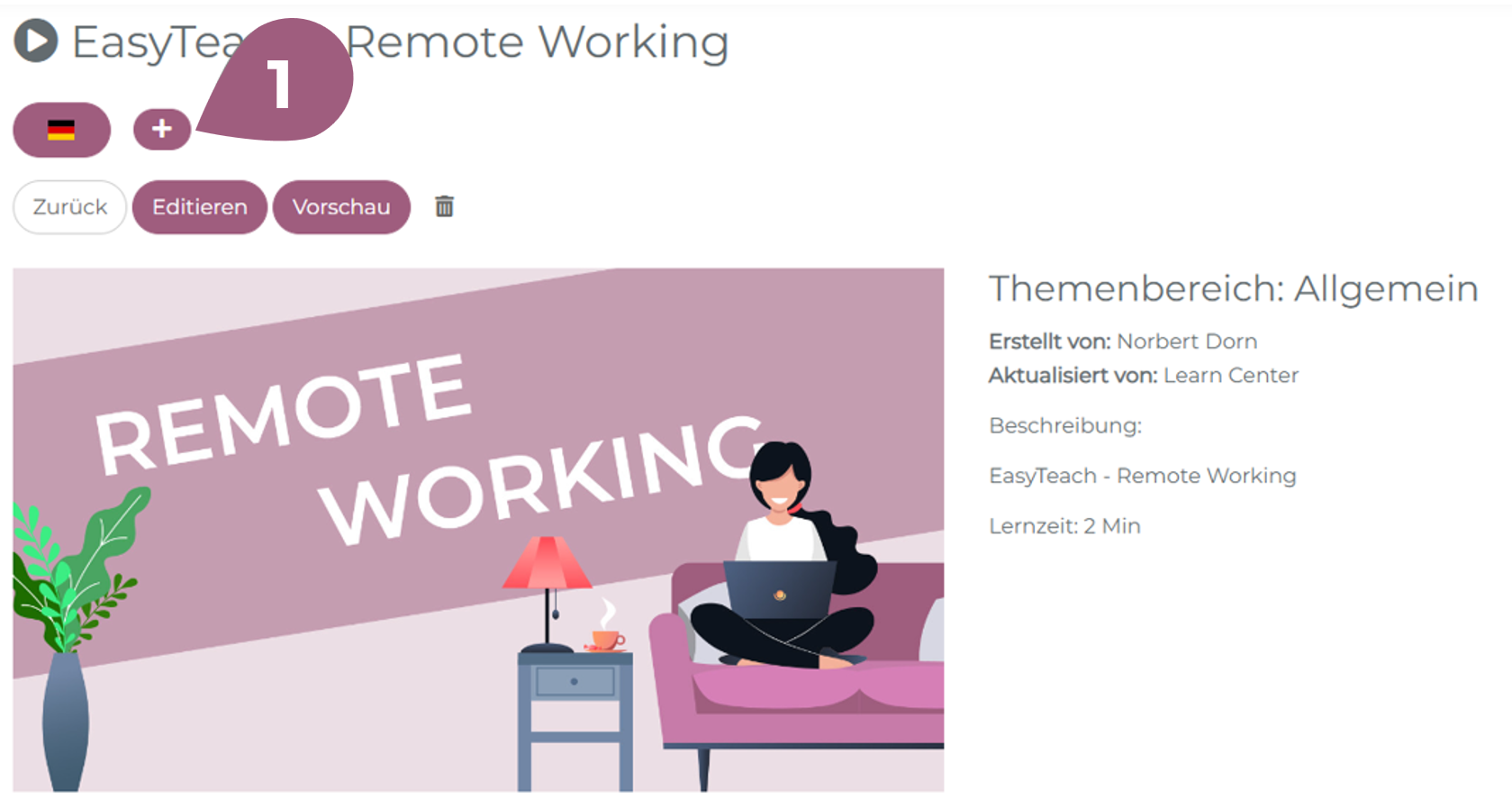 - Im Editiermodus der entsprechenden Lernelemente fügen Sie durch Klick auf das Plus (1) beliebig viele Sprachversionen hinzu.