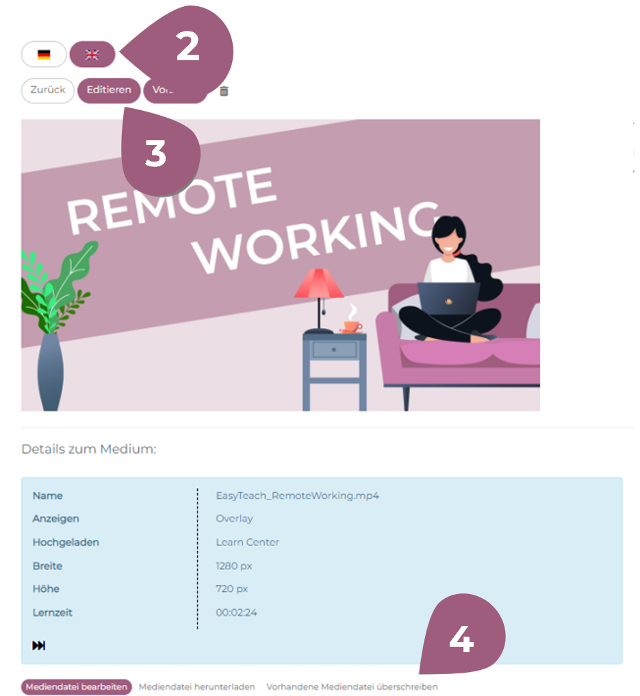 Sprachversionen für Kurse, Videos, Office-Dokumente, PDF, Tests, Kursreihen, Lernboxen und Feedbacks