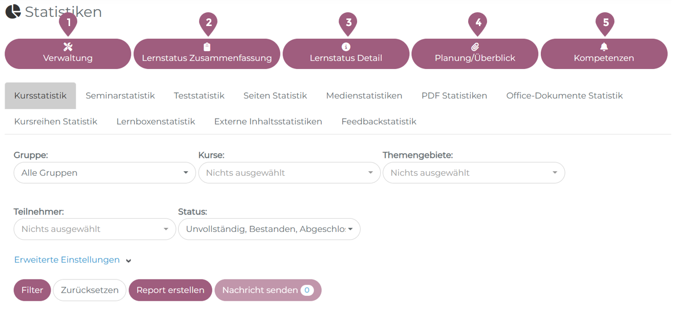 Der Statistikbereich befindet sich unter Administration > Benutzer > Statistiken. Hier ist eine Vielzahl an Informationen wie die Fortschritte der Lernenden für die einzelnen Lernformate, deren Login-Zeiten oder Freigaben für Lerneinheiten hinterlegt und auswertbar. Ihnen stehen dort verschiedene Tabs je nach Lernformat oder Funktion zur Verfügung. Abhängig vom Bereich können unterschiedliche Filter eingestellt werden (z.B. nach Gruppen, Benutzern oder Status). Gespeicherte Reports ermöglichen es, eine bestimmte Filter-Einstellung im Tab „Statistische Berichte” jederzeit mit einem Klick wieder zu öffnen. Dies bietet sich an, wenn eine bestimmte Auswertung regelmäßig erstellt werden muss und es vermeidet, dass jedes Mal alle Filter erneut ausgewählt werden müssen. Nach dem Update auf Version 4.5 hat der Statistikbereich ein neues Layout erhalten. Die Statistiken sind nun thematisch zugeordnet. Die neuen Themenbereiche sind: Verwaltung, Lernstatus – Zusammenfassung, Lernstatus – Detail, Planung/Überblick und Kompetenzen. Durch Klicken auf einen Themenbereich können Sie die zugehörigen Statistiken einsehen. Statistik der Ausbildungspunkte Interaktive Inhalte Statistiken Statistik der Ausbildungspunkte Statistiken