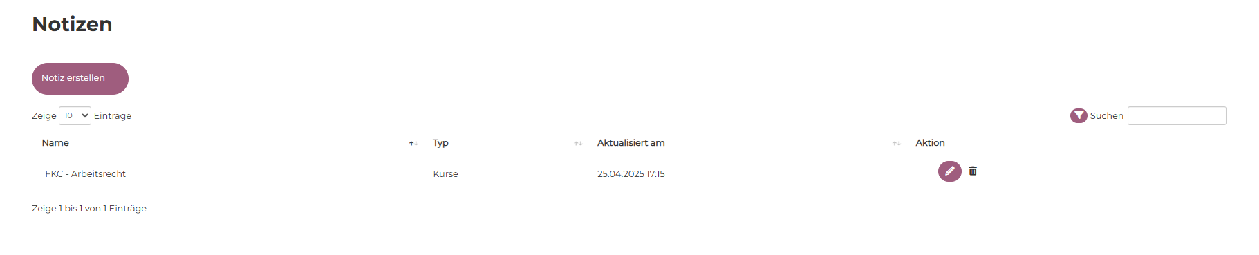 Alle Notizen lassen sich durch Klick auf die jeweilige Spalte sortieren und über das Suchfeld filtern.