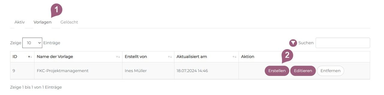 Nachdem ein Template abgespeichert wurde, finden Sie es im Tab „Vorlagen” (1).