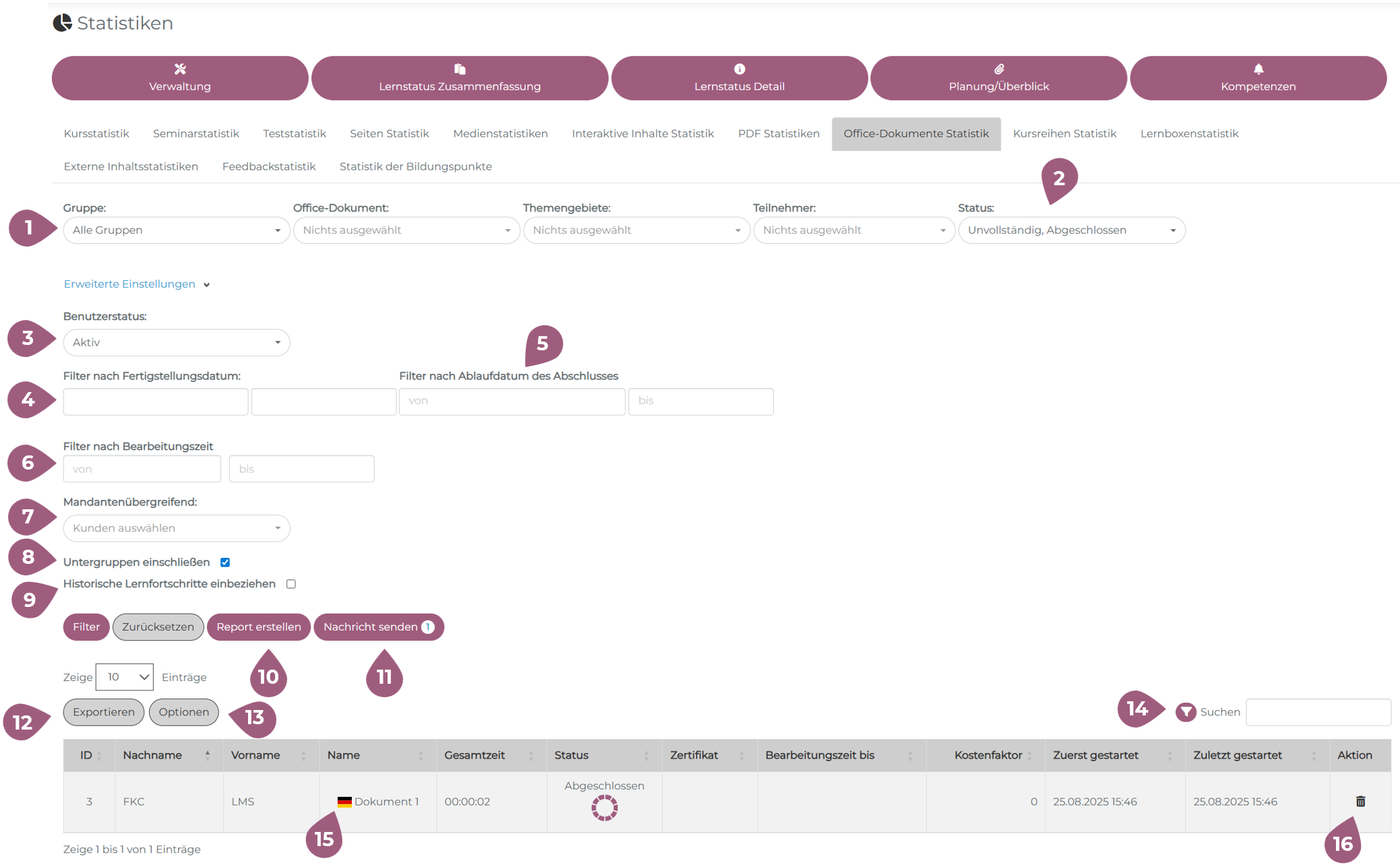 In der Office-Dokument-Statistik unter Administration > Benutzer > Statistiken > Lernstatus Detail wird der aktuelle Status der bereits zugewiesenen Office-Dokumente angezeigt. Folgende Optionen stehen Ihnen dort zur Verfügung: (1) Filter nach Gruppen, einzelnen Office-Dokumenten, Themengebieten, und Teilnehmern (2) Filter nach Status (Nicht gestartet / Unvollständig / Bewertung / Fehlgeschlagen / Bestanden) Unter „Erweiterte Einstellungen”: (3) Filter nach Benutzerstatus (aktiv / inaktiv / alle) (4) Filter nach Zeiträumen für Fertigstellungsdatum, sowie Ablauf des Abschlusses (5) oder der Bearbeitungszeit (6) (7) Mandantenübergreifend: Bei mandantenübergreifenden Office-Dokumenten können Sie hier auswählen aus welchen Mandanten die Statistikergebnisse angezeigt werden. (8) Option „Untergruppen einschließen”: Wenn diese Funktion deaktiviert ist, werden nur Ergebnisse für exakt die Gruppe, die unter (1) ausgewählt wurde, angezeigt. (9) Option “Historische Lernforschritte einbeziehen”: Wenn diese Funktion aktiviert ist, werden auch abgelaufene Abschlüsse angezeigt. (10) Es ist zudem möglich, eine Auswahl von Filtern durch Klick auf „Report erstellen“ zu speichern. Gespeicherte Reports ermöglichen es, eine bestimmte Filter-Einstellung im Tab „Statistische Berichte“ jederzeit mit einem Klick wieder zu öffnen. Dies bietet sich an, wenn eine bestimmte Auswertung regelmäßig erstellt werden muss und vermeidet, dass jedes Mal alle Filter erneut ausgewählt werden müssen. (11) Über den Button „Nachricht senden” kann den Benutzern auf Basis der gewählten Filter direkt eine Nachricht gesendet werden. (12) Über den Export-Button lassen sich die Ergebnisse als Excel-Datei exportieren. (13) Über den Button „Optionen“ können die Sichtbarkeit sowie die Reihenfolge der Spalten angepasst werden. (14) Mit dem Filtersymbol ist es möglich, jede Spalte individuell zu filtern, um gezielter suchen zu können. (15) Der Flagge Symbol zeigt auf welche Sprache die Dokumente erledigt werden. (16) Durch einen Klick auf das Müll-Symbol in der Spalte „Aktion“ kann eine Seite von einem Teilnehmern gelöscht werden. Office-Dokumente Statistik