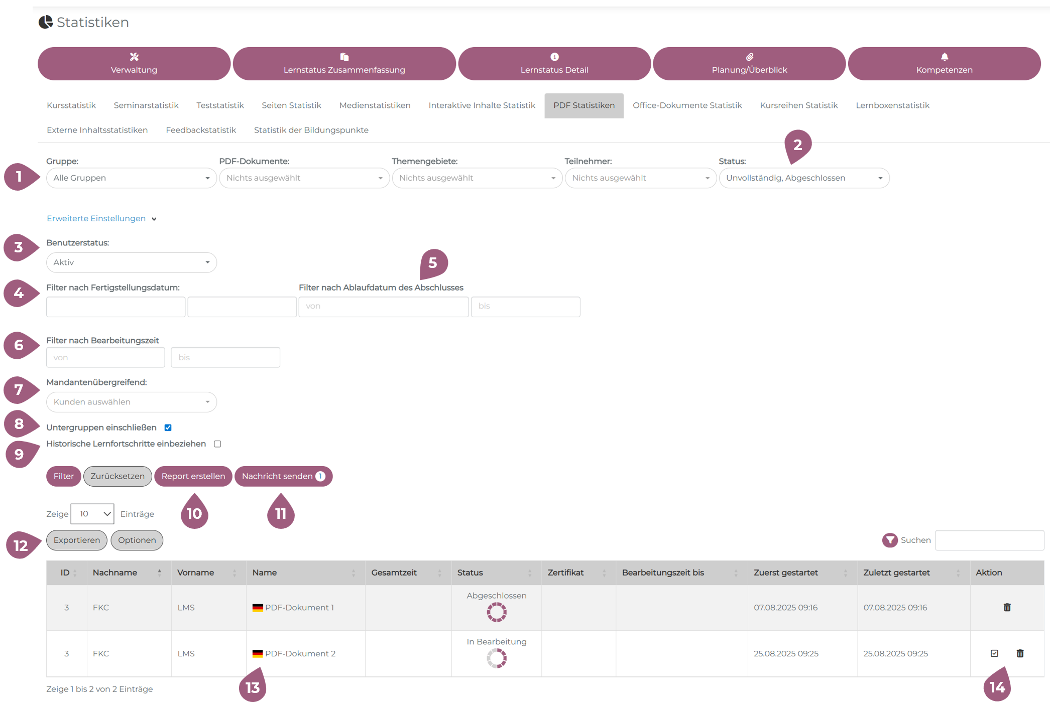 In der PDF Statistiken (Lernstatus Detail) kann eine Übersicht der Status aktuell zugewiesener PDF-Dokumente erfolgen. Folgende Optionen stehen Ihnen dort zur Verfügung: (1) Filter nach Gruppen, einzelnen PDF-Dokumenten, Themengebieten und Teilnehmern (2) Filter nach Status (Nicht gestartet / Unvollständig / Abgeschlossen) Nach Aufklappen der „Erweiterten Einstellungen”: (3) Filter nach Benutzerstatus (aktiv / inaktiv / alle) Filter nach Fertigstellungsdatum (4), Ablauf des Abschlusses (5) oder der Bearbeitungszeit (6) des PDF-Dokuments stehen Ihnen zur Verfügung. (7) Mandantenübergreifend: Bei mandantenübergreifenden PDF-Dokumenten können Sie hier auswählen aus welchen Mandanten die Statistikergebnisse angezeigt werden. (8) Option „Untergruppen einschließen“: Wenn diese Funktion deaktiviert ist, werden nur Ergebnisse für exakt die Gruppe, die unter (1) ausgewählt wurde, angezeigt. (9) Option “Historische Lernforschritte einbeziehen”: Wenn diese Funktion aktiviert ist, werden auch abgelaufene Abschlüsse angezeigt. Hinweis: Wenn auch Ergebnisse mit dem Status “Nicht gestartet” angezeigt werden sollen, muss hierfür aus Performancegründen zuerst die Funktion “Untergruppen einschließen” deaktiviert werden und die gewünschte Gruppe ausgewählt werden. (10) Es ist zudem möglich, eine Auswahl von Filtern durch Klick auf „Report erstellen“ zu speichern. Gespeicherte Reports ermöglichen es, eine bestimmte Filter-Einstellung im Tab „Statistische Berichte“ jederzeit mit einem Klick wieder zu öffnen. Dies bietet sich an, wenn eine bestimmte Auswertung regelmäßig erstellt werden muss und vermeidet, dass jedes Mal alle Filter erneut ausgewählt werden müssen. (11) Über den Button „Nachricht senden” kann den Benutzern auf Basis der gewählten Filter direkt eine Nachricht gesendet werden. (12) Über den Export-Button lassen sich die Ergebnisse als Excel-Datei exportieren. (13) Der Flagge Symbol zeigt auf welche Sprache die PDF-Dokumente erledigt werden. (14) Durch einen Klick auf das Müll-Symbol in der Spalte „Aktion“ kann ein PDF-Dokument von einem Teilnehmern gelöscht (Papierkorb-Symbol) oder manuell als abgeschlossen markiert (Checkbox-Symbol) werden.PDF-Statistiken