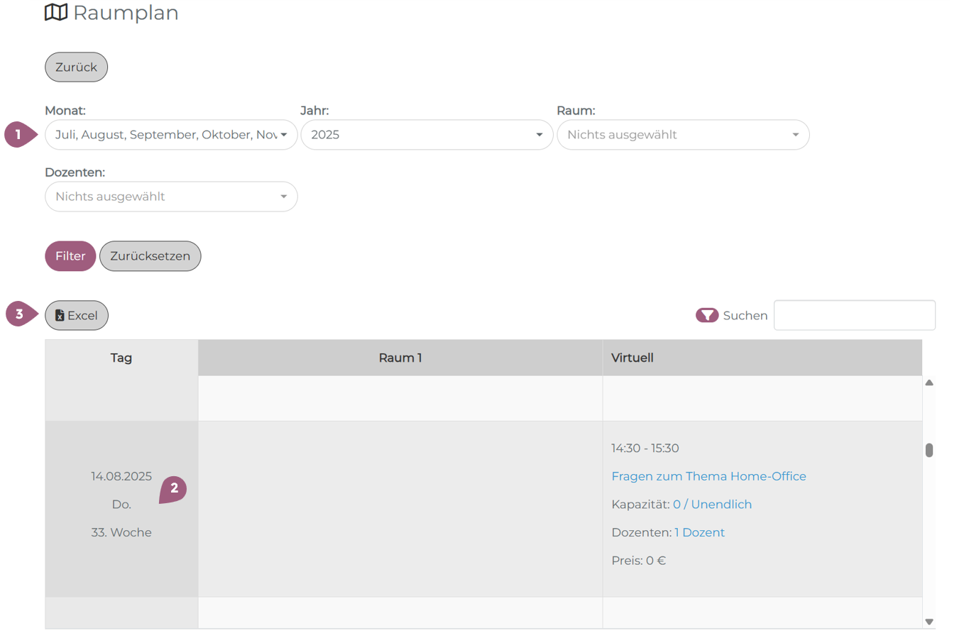 Dazu gibt es an erster Stelle die Filtermöglichkeiten Monat, Jahr, Raum oder Dozent (1).
