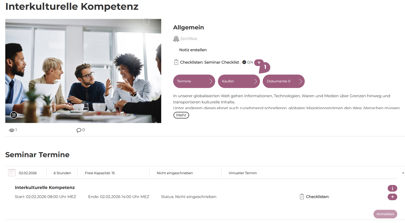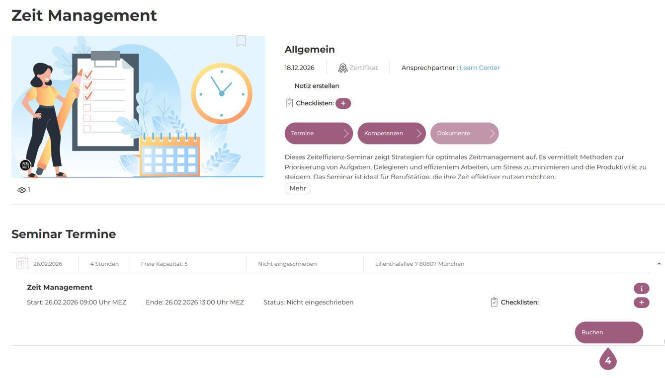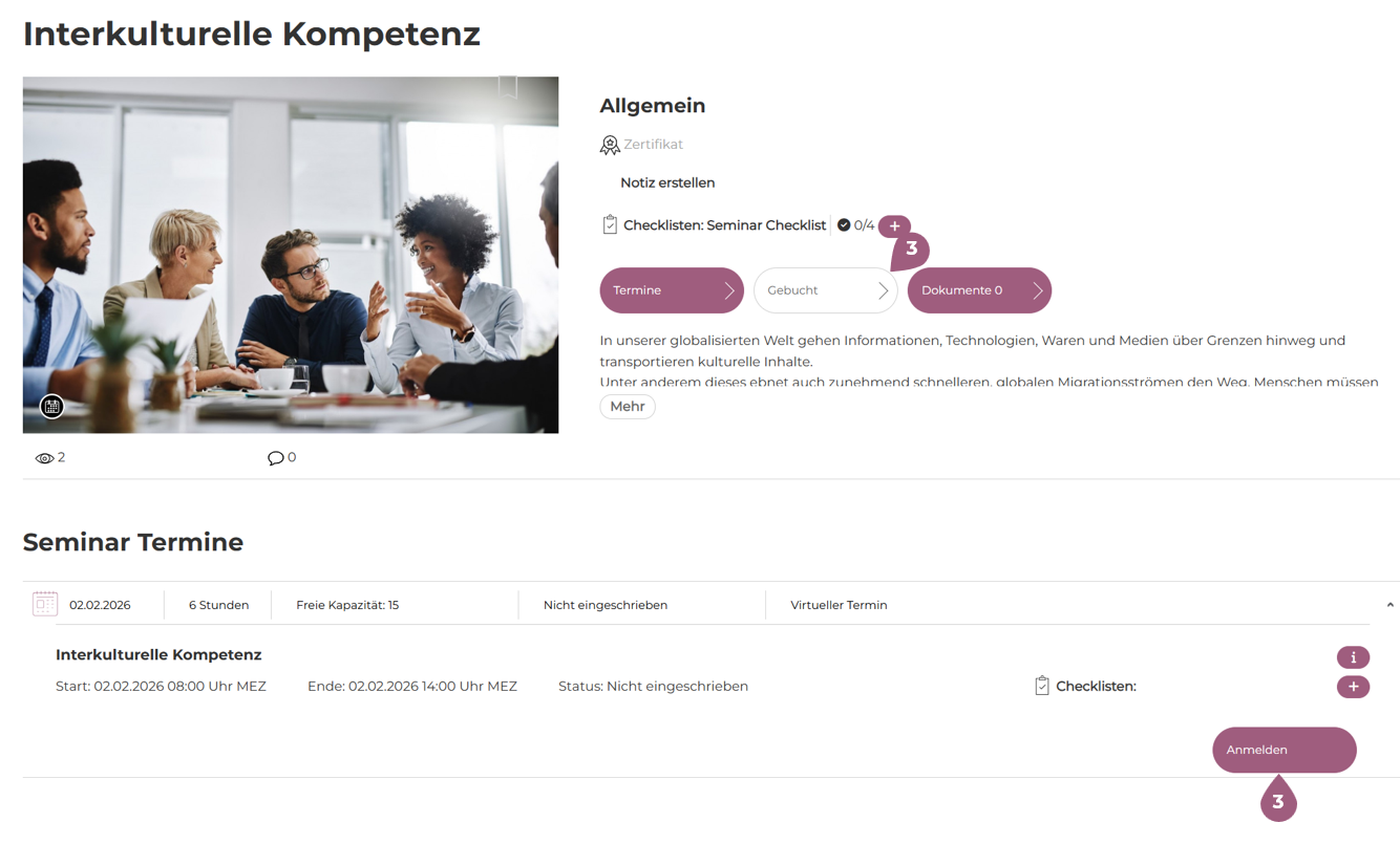 Nachdem die Benutzer das Seminar gebucht haben, können sie sich zum Seminar anmelden (3). Sie können aus den freigeschalteten Terminen auswählen. Wenn eine Mehrfachanmeldung möglich ist, können sie sich auch zu mehreren Terminen anmelden.