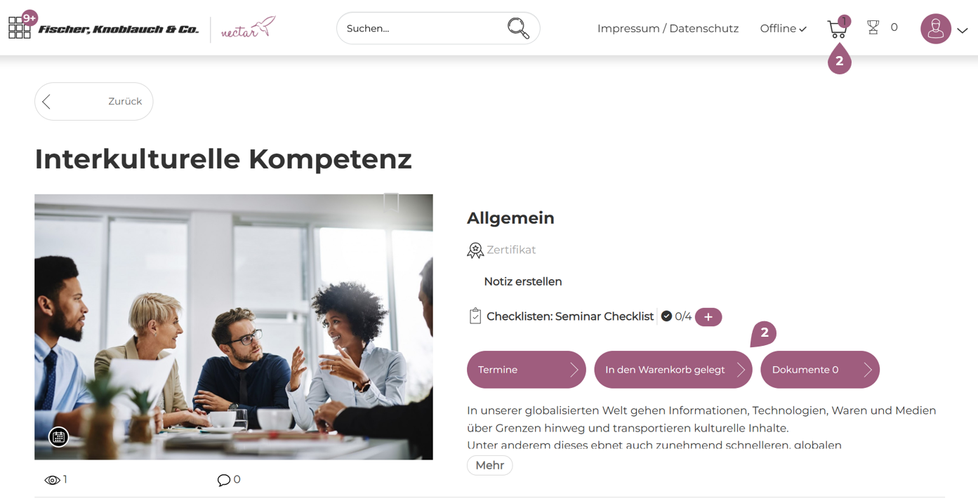 Wenn der Einkaufswagen unter Einstellungen > Konfiguration aktiviert ist, müssen die Benutzer das Seminar zunächst kaufen (2). Andernfalls wird das Seminar direkt gebucht.