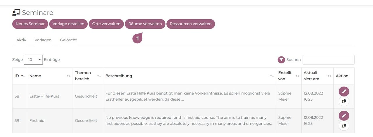 Mit Klick auf „Räume verwalten” (1) gelangen Sie auf die Übersicht der bereits erstellten Räume für Seminare. In der Raumübersicht werden alle vorhandenen Räume mit der zugehörigen Raum-ID, dem Raumnamen, der Telefonnummer, der Beschreibung, der Kapazität und dem Ort des Raums dargestellt. In dieser Übersicht besteht die Möglichkeit, einen neuen Raum hinzuzufügen (2) oder die bereits erstellten Räume zu editieren (3).