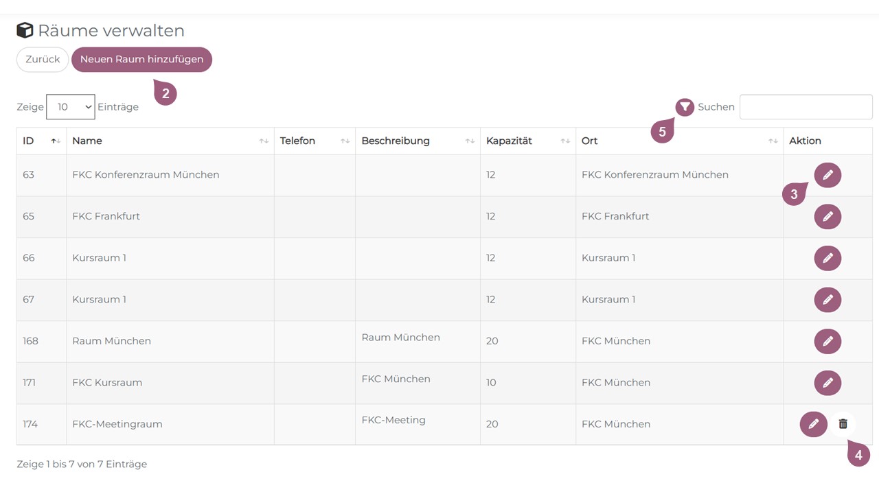 Über die Suche (5) lässt sich die Raumliste filtern. Die Sortierung der Spalten lässt sich jeweils durch Klick auf die Kopfzeile anpassen.