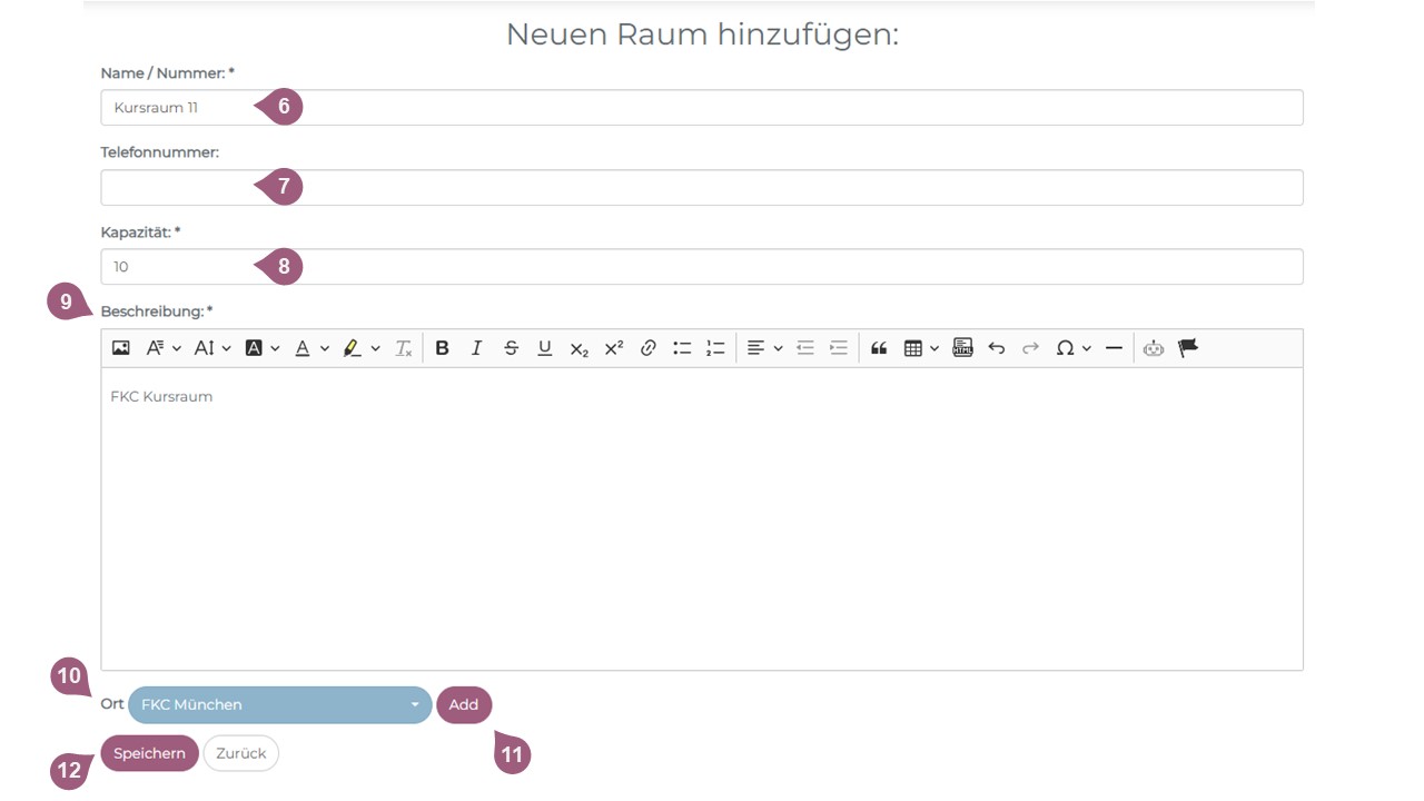 Wenn Sie einen neuen Raum hinzufügen (2) wollen, müssen Sie zunächst einen Raumnamen bzw. eine Raumnummer (6) angeben. Eine Telefonnummer (7) einzutragen ist optional. Außerdem müssen Sie angeben, welche Kapazität (8) der Raum hat, um die maximale Teilnehmeranzahl zu definieren. Eine Beschreibung (9) für den Raum anzugeben gehört zu den Pflichtfeldern. Bevor Sie einen Raum erstellen, sollten Sie unter „Orte erstellen” bereits einen Ort hinterlegt haben. Somit können Sie den Raum unter einem bereits hinterlegten Ort zuordnen (10) oder einen neuen Ort erstellen (11).