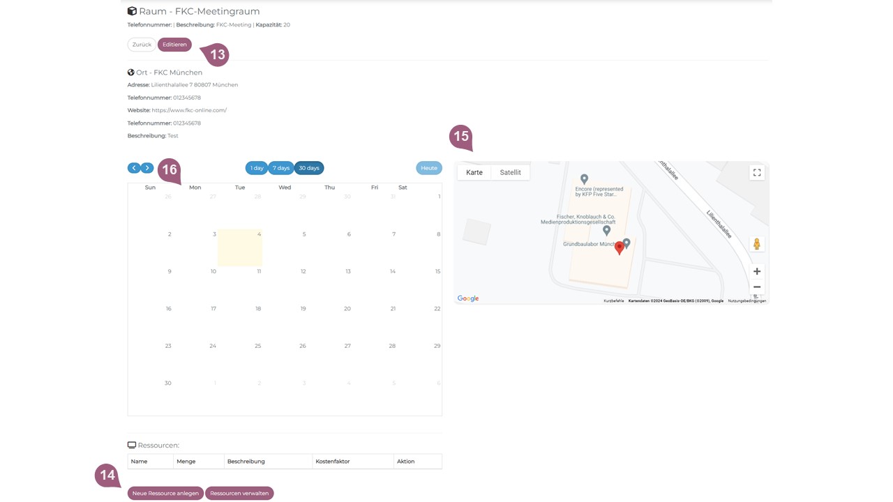 Nachdem Sie den Raum erfolgreich gespeichert (12) haben, gelangen Sie auf die Übersicht des Raums. An dieser Stelle können Sie die Informationen zu dem Raum bearbeiten (13) und dem Raum eine Ressource hinzufügen (14) und diese ebenfalls verwalten. In dieser Übersicht sehen Sie die Informationen über den Ort, dem Sie den Raum zugeordnet haben. Die Lage des Orts wird mithilfe einer Kartenansicht (15) dargestellt. Im Kalender (16) sind die Daten zu sehen, an denen der Raum belegt ist. Die Ressourcen die zu dem Raum gehören, können Sie aus den Tabellen entnehmen. Weitere Informationen erhalten Sie unter Ressourcen erstellen.
