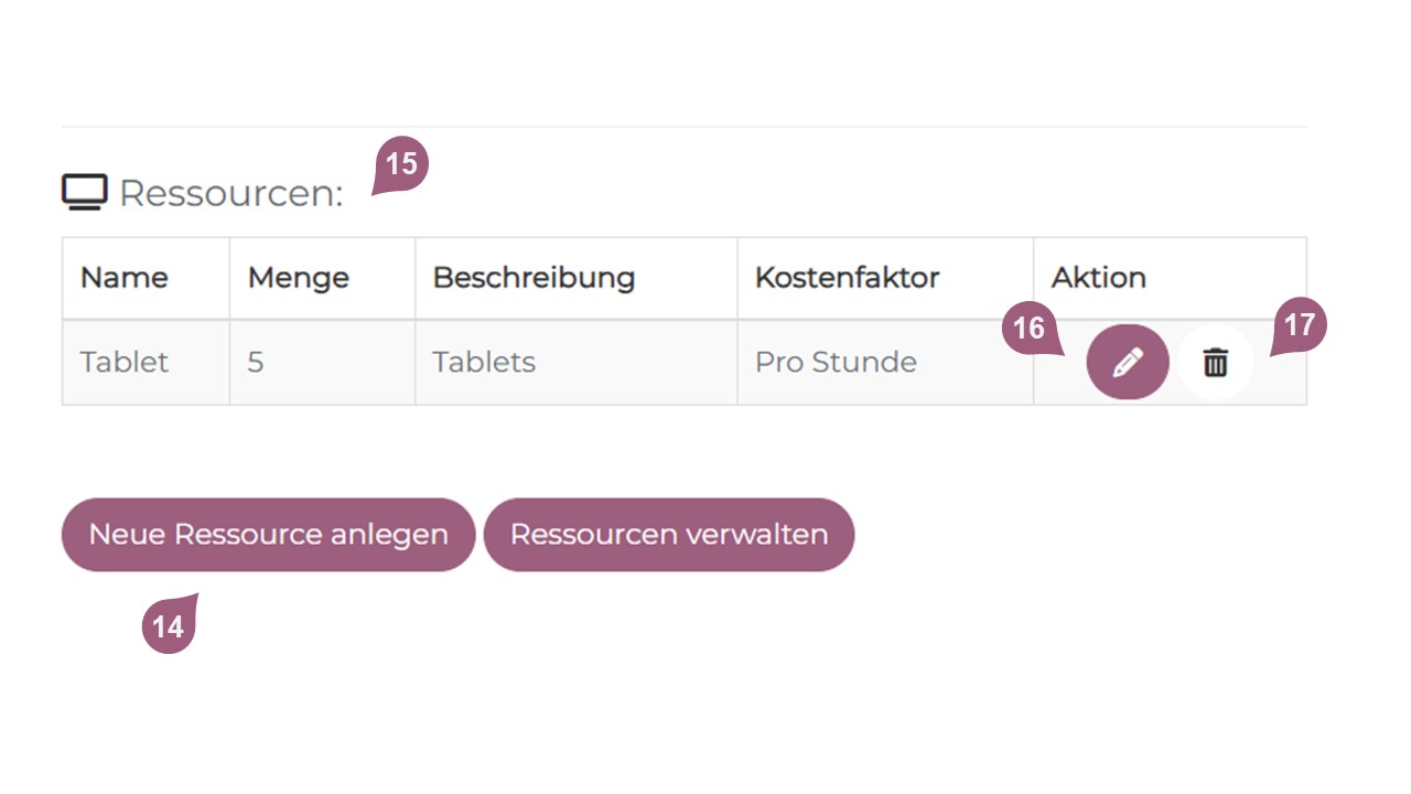 In der Tabelle (15) werden alle zu dem Raum gehörenden Ressourcen angezeigt, diese können Sie bearbeiten (16) oder löschen (17). Die Ressourcen können Sie über „Neue Ressource anlegen” (14) hinzufügen oder über Ressourcen verwalten bearbeiten.
