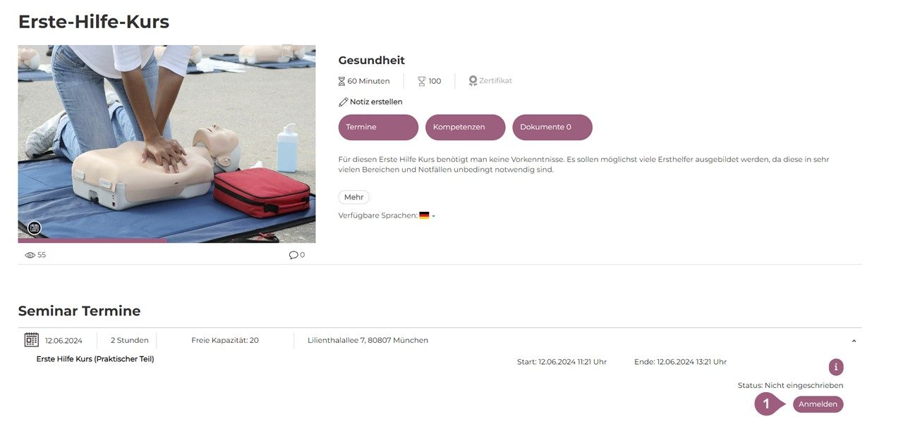 Wenn ein Seminar ohne spezielle Einstellungen erstellt und einer Gruppe zugewiesen wird, ist es für die Lerner dieser Gruppe sichtbar und sie können sich für beliebig viele Termine eines Seminars einschreiben, indem sie sich „Anmelden” (1). Wurde bei den Einstellungen ein Häkchen bei „ Anmeldung nur für eine Sitzung (4)” gesetzt, können sich die Lernenden nur für einen Termin eines Seminars anmelden. Ist ein Häkchen bei „Automatische Anmeldung (6)” gesetzt, werden alle Benutzer der Gruppe automatisch zu allen Terminen des betreffenden Seminars angemeldet, sobald Sie ein Seminar einer Gruppe zuordnen. Wenn nicht genügend Plätze vorhanden sind und somit nicht alle Benutzer aus der Gruppe angemeldet werden können, wird der Administrator darüber benachrichtigt.