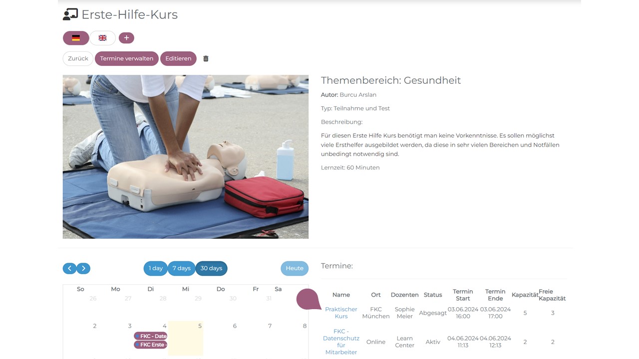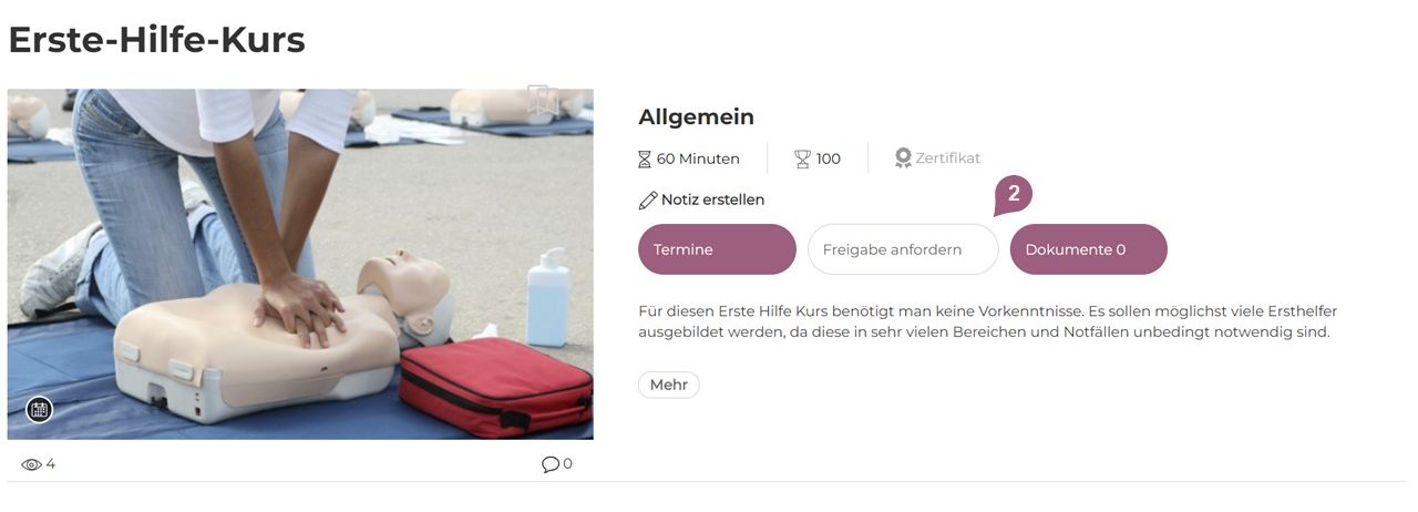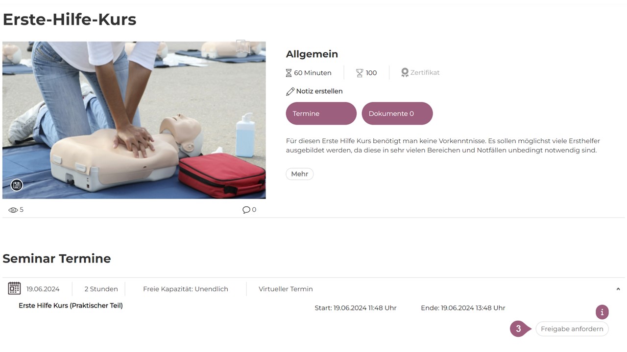 Optional besteht die Möglichkeit, unter Einstellungen die „Freigabe-Funktion (11)”  für Seminare (2) oder einzelne Seminartermine (3) zu aktiveren. In diesem Fall muss die Teilnahme durch den Benutzer erst beantragt und vom Vorgesetzten oder einem Administrator bestätigt werden. Die Teilnehmenden sehen dann einen „Freigabe anfordern-Button anstelle des „Anmelden-Buttons. Die Person, die beim Benutzer als Vorgesetzter hinterlegt wurde, bekommt so eine Nachricht mit der Freigabeanforderung. Wird ein Lernender manuell von einem Administrator für ein Seminar eingeschrieben, obwohl eine Freigabe nötig ist, ist der Lernende ohne weitere Schritte für das Seminar angemeldet.