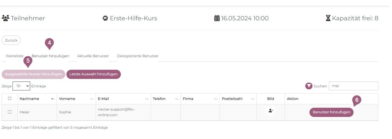 Sie gelangen auf die Teilnehmerübersicht und können über den Reiter Benutzer hinzufügen (4) mehrere Benutzer markieren und für das Seminar hinzufügen (5) oder einzelne Benutzer hinzufügen (6).